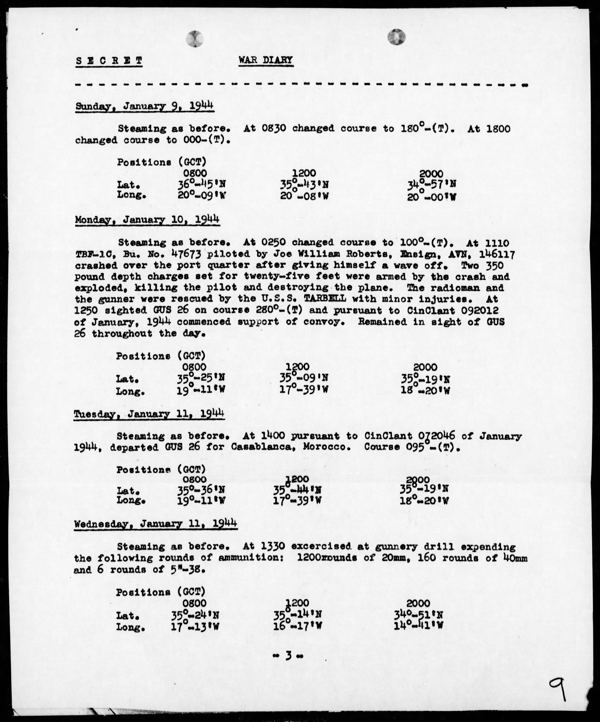 Steaming as before, At 0250 changed course to 100 – (T). At 1110 TBF-1c, Bu. No. 47673 piloted by Joe William Roberts, Ensign, AVN 146117 crashed over the port quarter after giving himself a wave off. Two 350 pound depth charges set for twenty-five feet were armed by the crash and exploded, killing the pilot and destroying the plane. The radioman and the gunner were rescued by the U.S.S. Terbell with minor injuries. At 1250 sighted GUS 26 on course 280-(T) and pursuant ot CinClant 092012 of January. 1944 commenced support of convoy. Remained in sight of GUS 26 throughout the day.