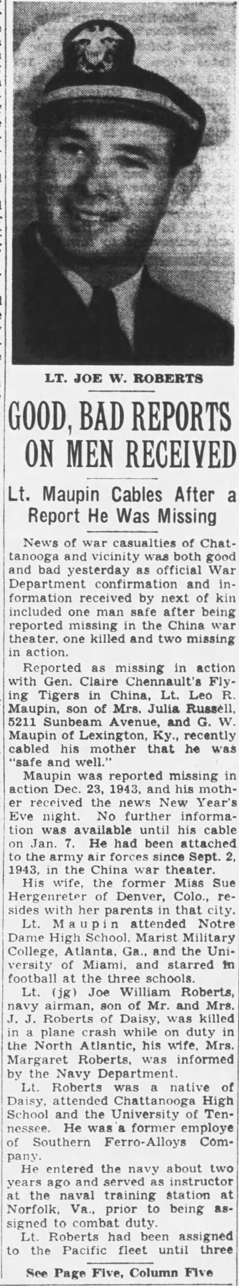 Lt. Roberts was a native of Daisy, attended Chattanooga High School and the University of Tennessee. He was a former employe of SOuther Ferro-Alloys Company. He entered the navy about two years ago and served as instructor at the naval training station at Norfolk, Va., prior to being assigned to combat duty. Lt. Roberts had been assigned to the Pacific fleet until three months ago, when he was transferred to the North Atlantc theater of operations. Survivors are his wife; his parents and a sister, Mrs. George Brown, Waterport, N.Y.