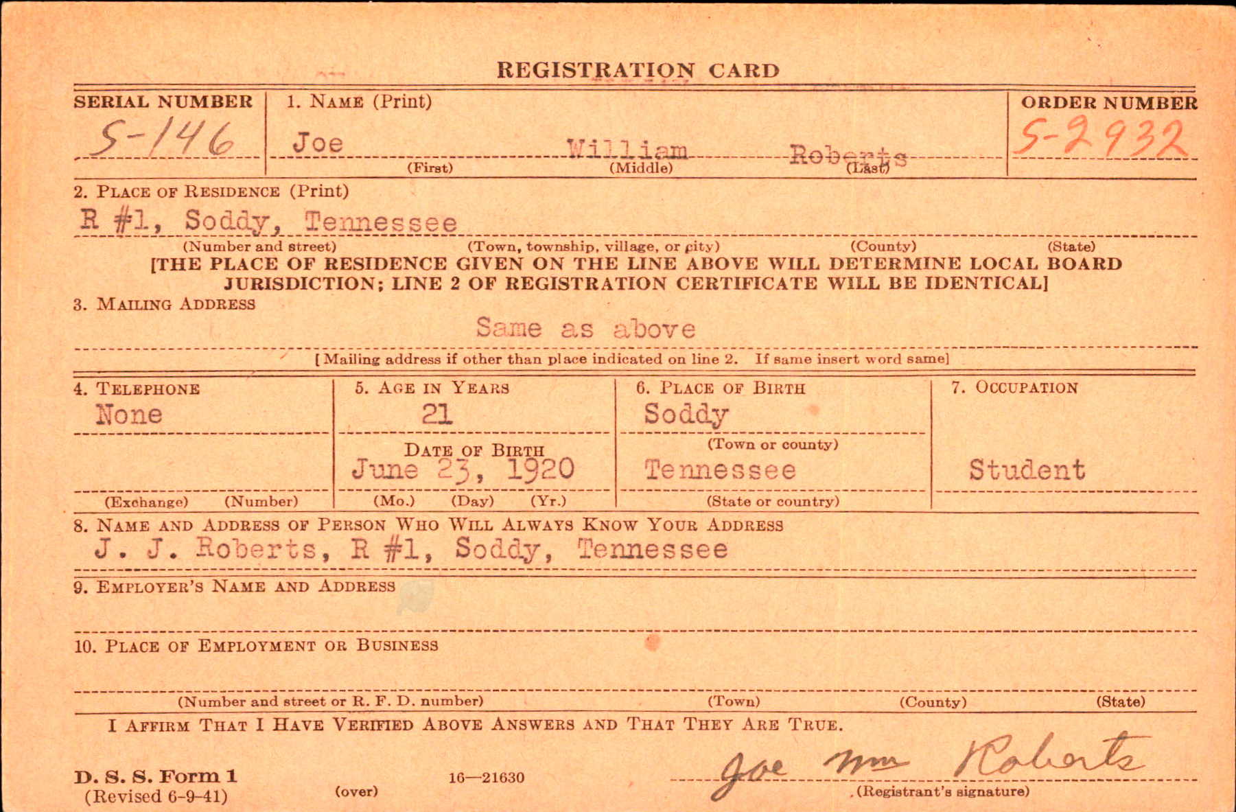 Joseph “Joe” William Roberts was born at Soddy, Tennessee, the son of Joseph J. Roberts and Iva Hazel Cox. He was married to Margaret Elizabeth Davidson.