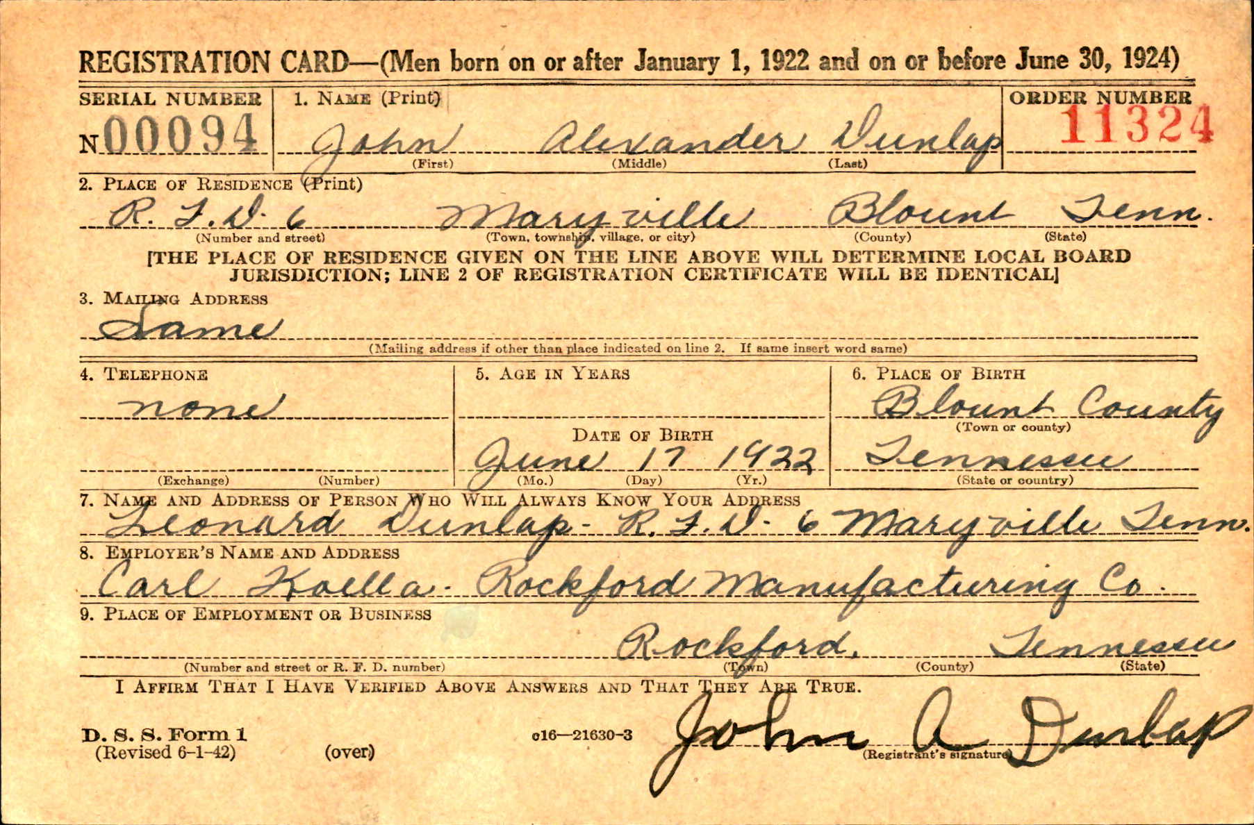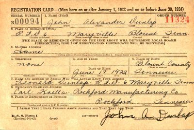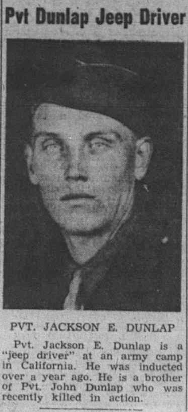 Pvt. John A. Dunlap, 21, has been reported killed in action in Italy, Nov. 10. Pvt. Dunlap enlisted in July, 1942 and had been serving overseas since February with the Army Infantry. He is survived by his mother, Mrs. Mart Dunlap, a sister, Mrs. Marshall Moore, two brothers, Leonard of Maryville and Pvt. Jackson E. who is stationed in California.