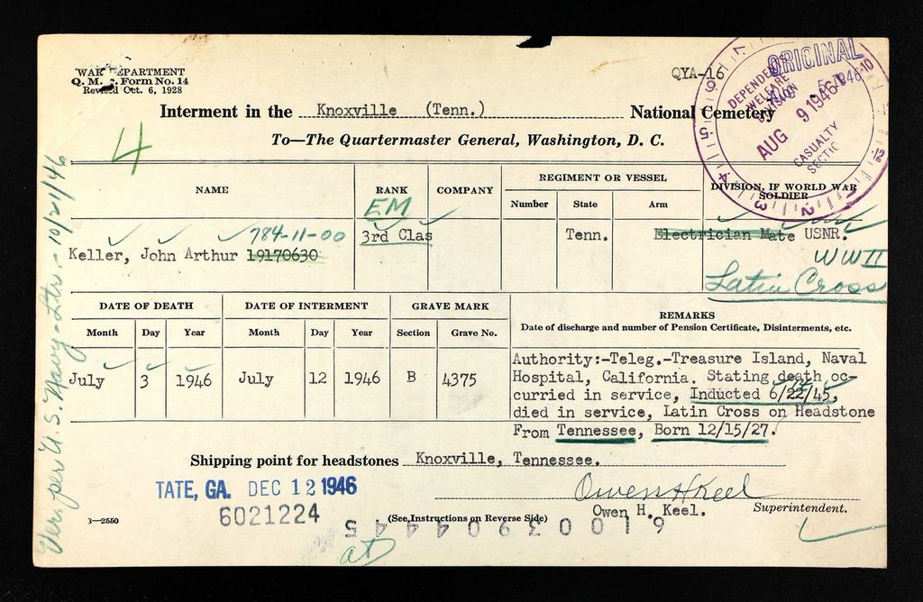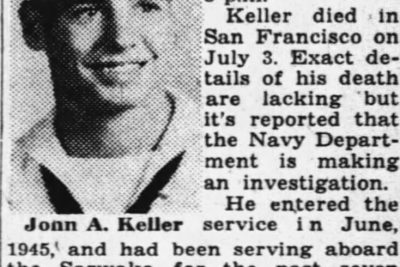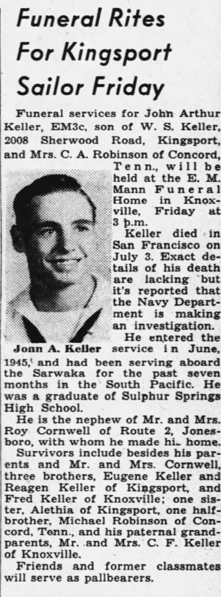 Funeral services for John Arthur Keller, EM3C, son of W.S. Keller, 2008 Sherwood Road, Kingsport, and Mrs. C.A. Robinson of Corcord, Tenn., will be held at the E.M. Mann Funeral Home in Knoxville. Keller died in San Francisco on July 3. Exact details of his death are lacking but it’s reported that the Navy Department is making an investigation. He entered the service in June, 1945 and had been serving aboard the Sarwaka for the past seven months in the South Pacific. He was a graduate of Sulphur Springs High School. He is the nephew of Mr. and Mrs. Roy Cornwell of Route 2, Jonesboro, with whom he made his home. Survivors include besides his parents and Mr. and Mrs. Cornwell, three brothers, Eugene Keller and Reagen Keller of Kingsport, and Fred Keller of Knoxville; one sister, Alethia of Kingsport, one halfbrother, Michael Robinson of Concord, Tenn., and his paternal grandparents, Mr. and Mrs. C.F. Keller of Knoxville.