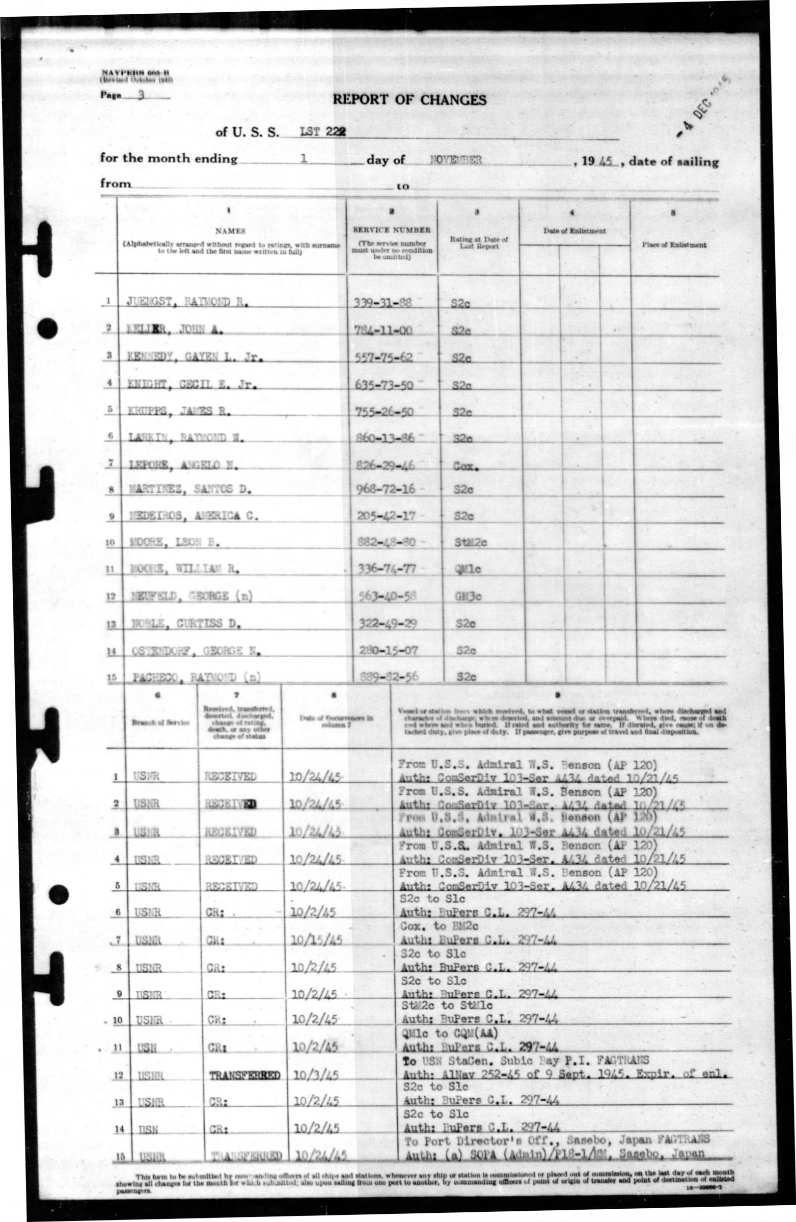 He served on the U.S.S. LST 222 in November 1945