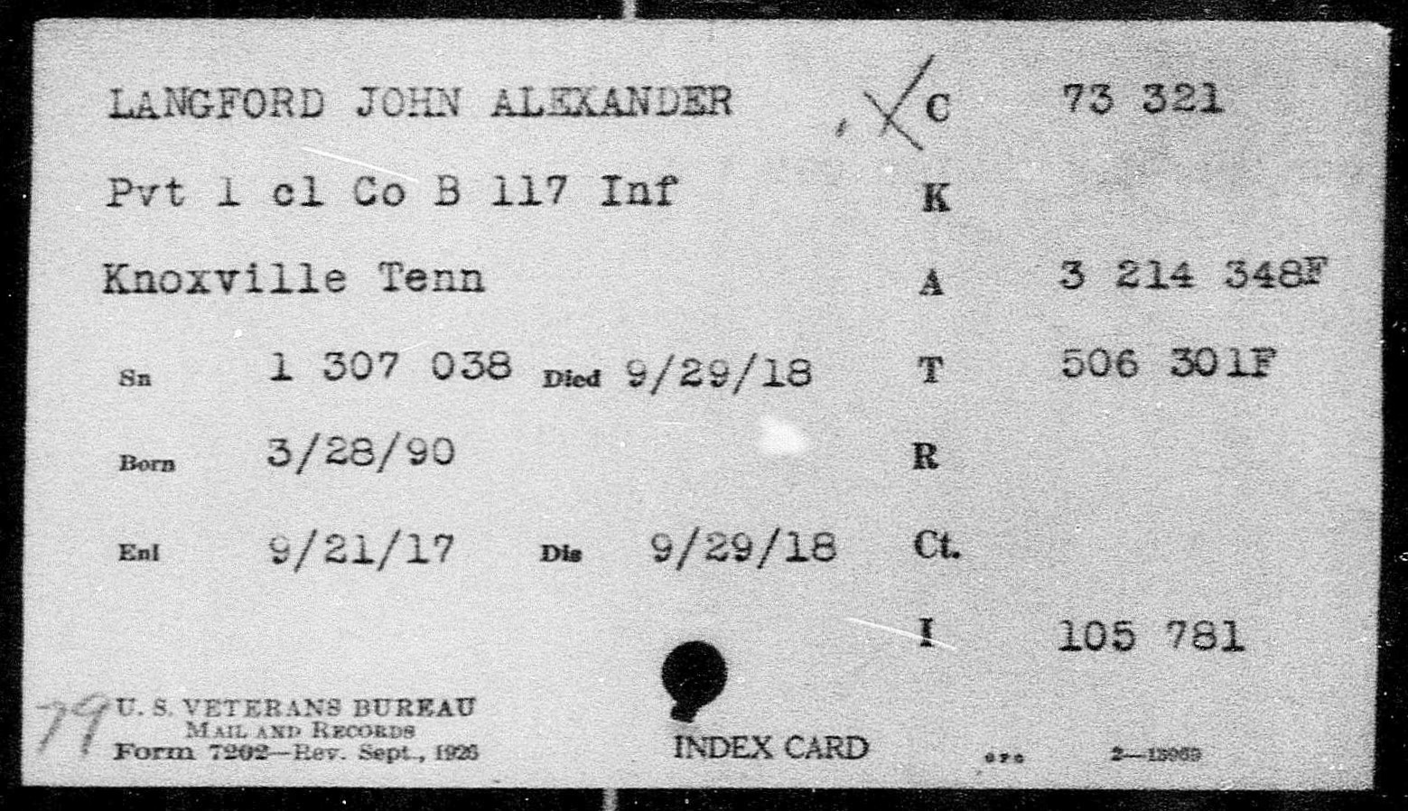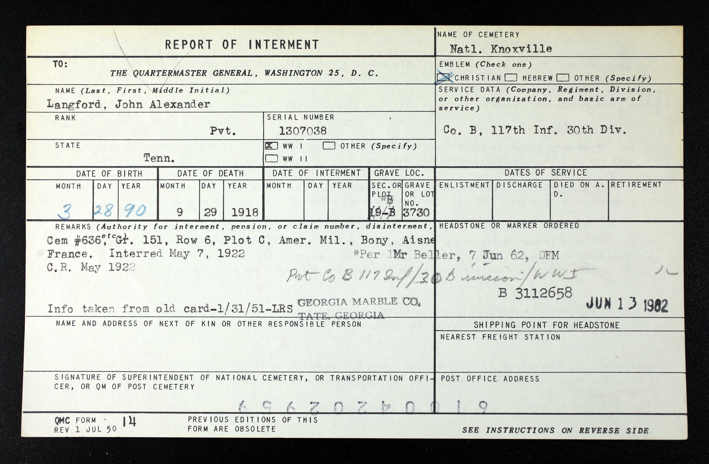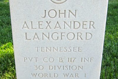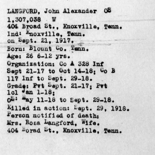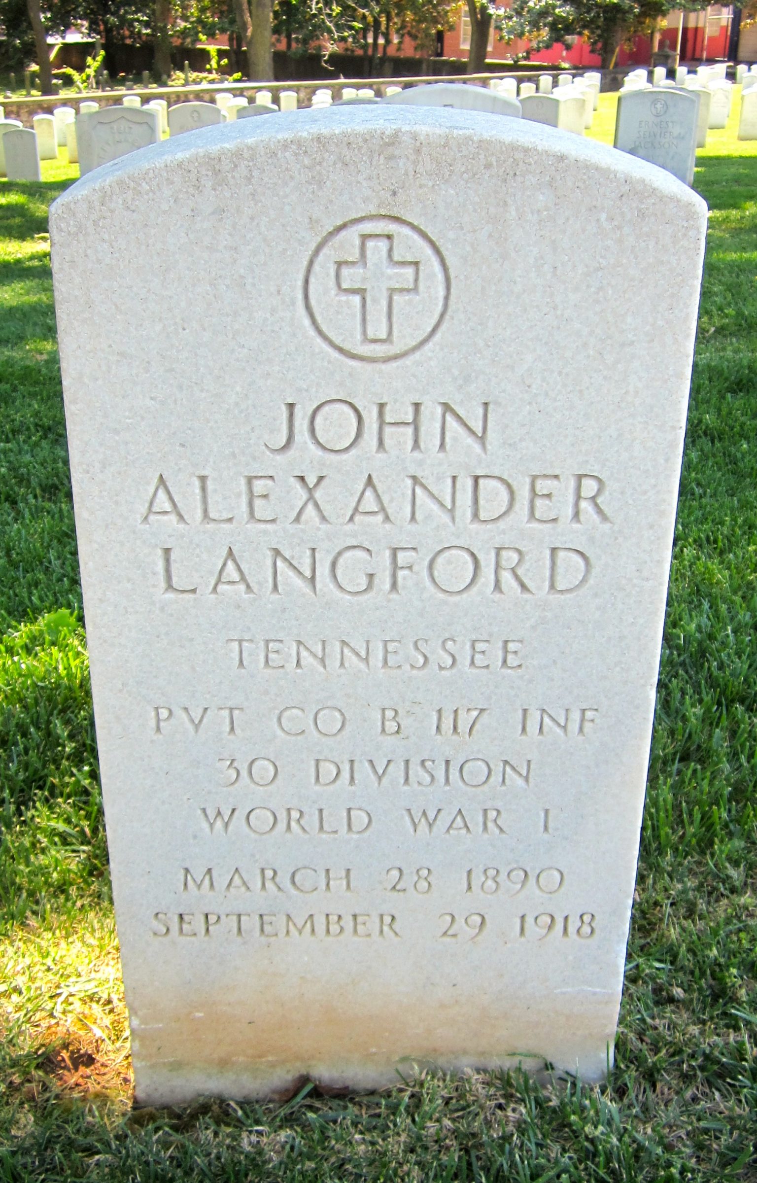 John Alexander Langford answered the call to the colors on September 5, 1917. First assigned to Company A, 328th Infantry, 82nd Division, with headquarters at Camp Gordon, GA. Later transferred to Company B, 117th Infantry, 30th Division, stationed at Camp Sevier, SC. As a member of the latter named organization embarked for France on May 11, 1918. Private Langford was killed in action on September 29, 1918, in the Somme Offensive. He was initially buried at the American War Cemetery Bony, Aisne in France. He is buried at Knoxville National Cemetery, Knoxville, Tennessee.