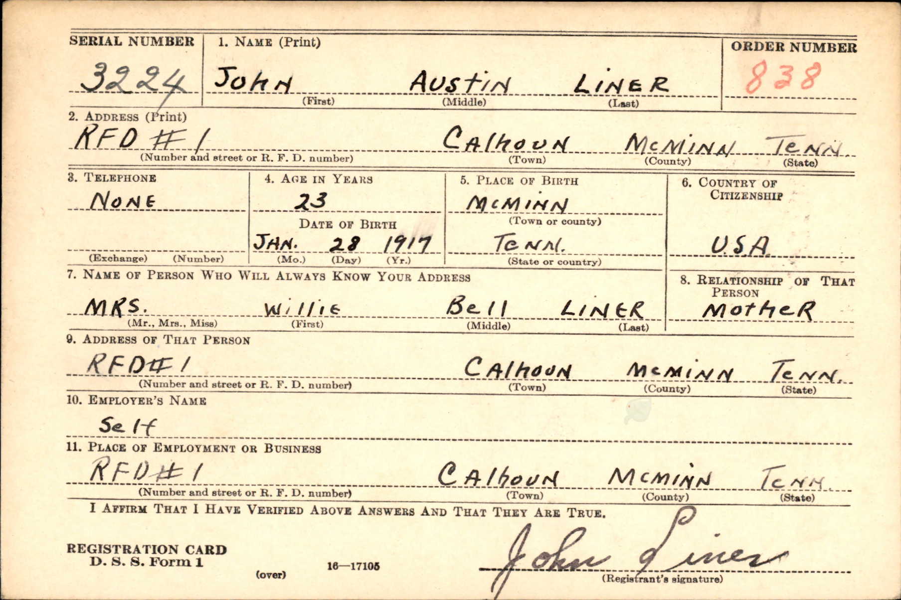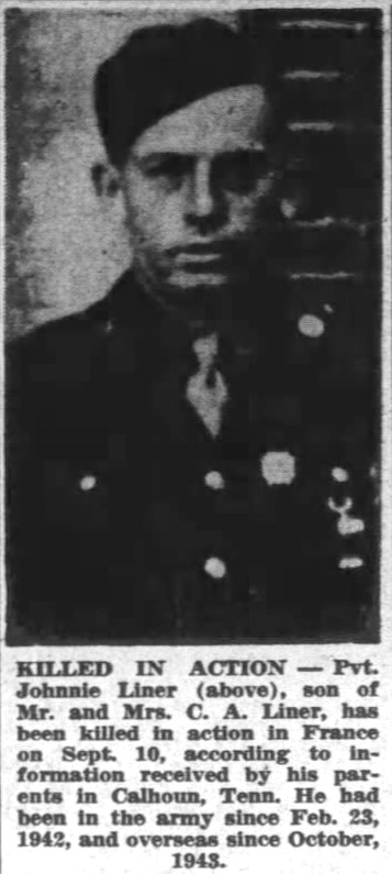 John Austin “Johnnie” Linerwas the son of Colonel Adolphus “Dolph” Liner and Willie Bell Rowland. He had been in the Army since 23 February 1942 and overseas since October, 1943.