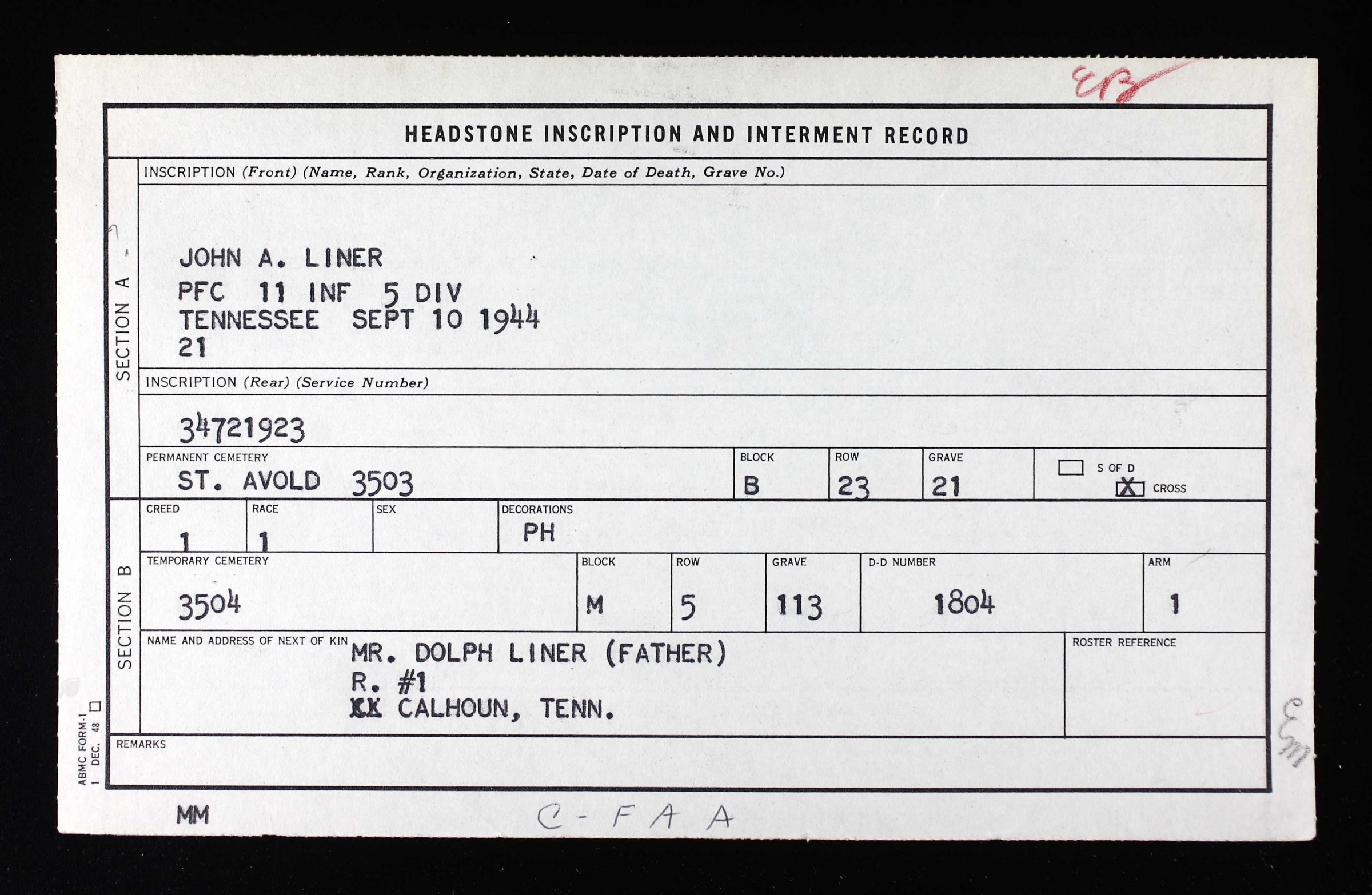 Pfc. Liner was killed in action in France. He was initially buried at Andilly Cemetery at Lay St. Rémy, France and reburied at Lorraine American Cemetery, St. Avold, France, B, 23, 21