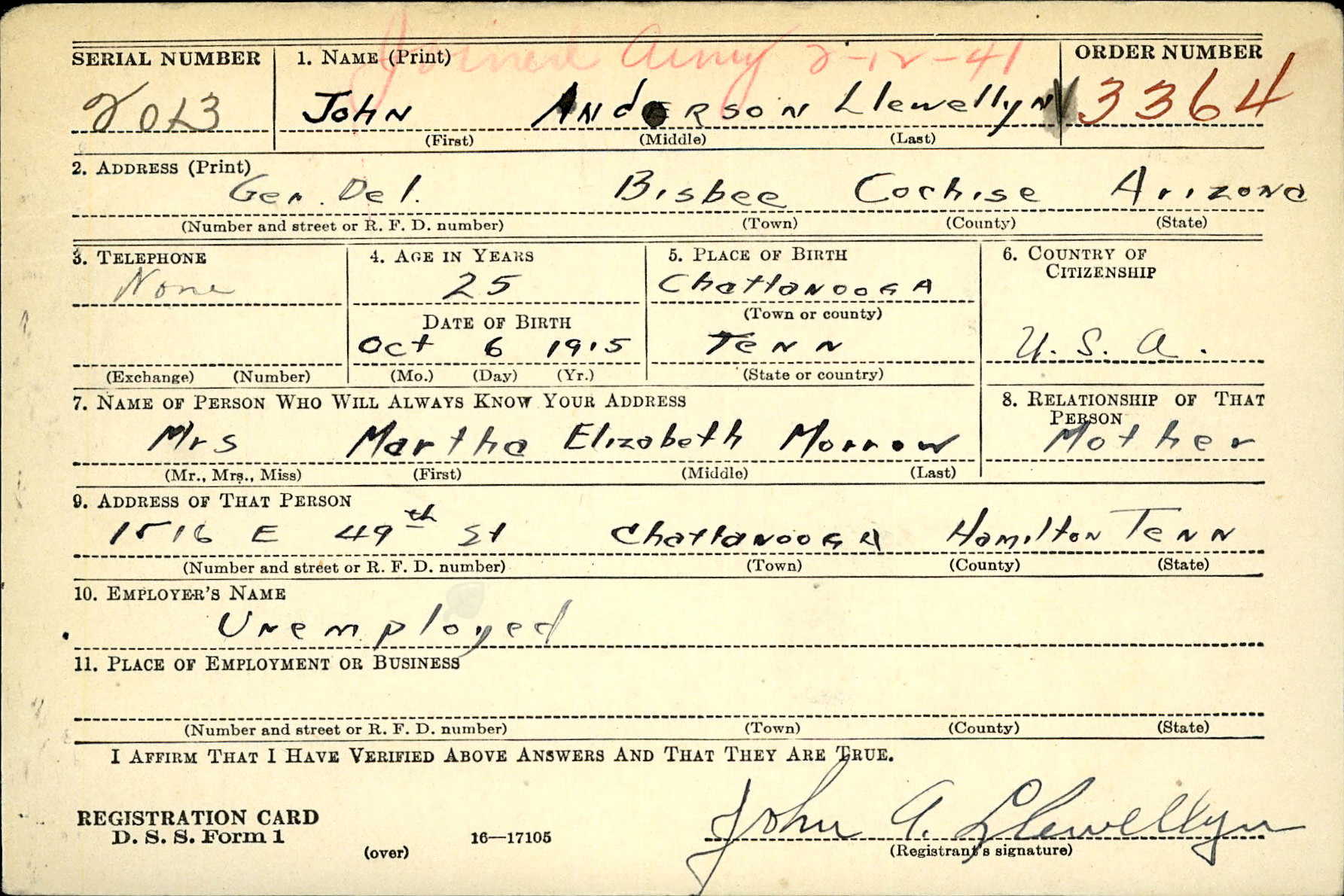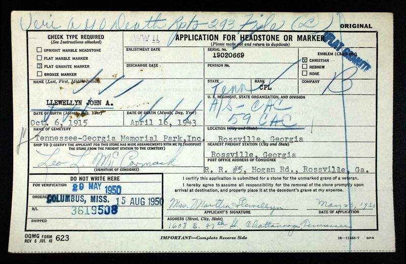 John Anderson Lewellyn was born on 6 October 1915 in Chattanooga, Tennessee to William Anderson Llewellyn and Martha Elizabeth Cantrell. His brother Gunnersmate Third Class George Samuel Lewellyn was reported as missing in action and is memorialized at the Normandy American Cemetery in France.