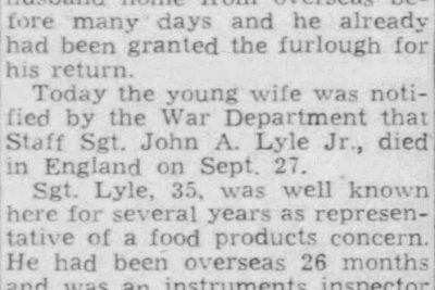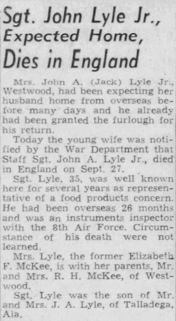 Mrs. John A. (Jack) Lyle Jr., Westwood, had been expecting her husband home from overseas before many days and he already had been granted the furlough for his return. Today the young wife was notified by the War Department that Staff Sgt. John A. Lyle Jr., died in England on Sept. 27. Sgt. Lyle, 35, was well known here for several years as representative of a food products concern. He had been overseas 26 months and was an instruments inspector with the 8th Air Force. Circumstance of his death were not learned. Mrs. Lyle, the former Elizabeth F. McKee is with her parents, Mr. and Mrs. R.H. McKee, of Westwood. Sgt. Lyle was the son of Mr. and Mrs. J.A. Lyle, of Talladega, Ala.