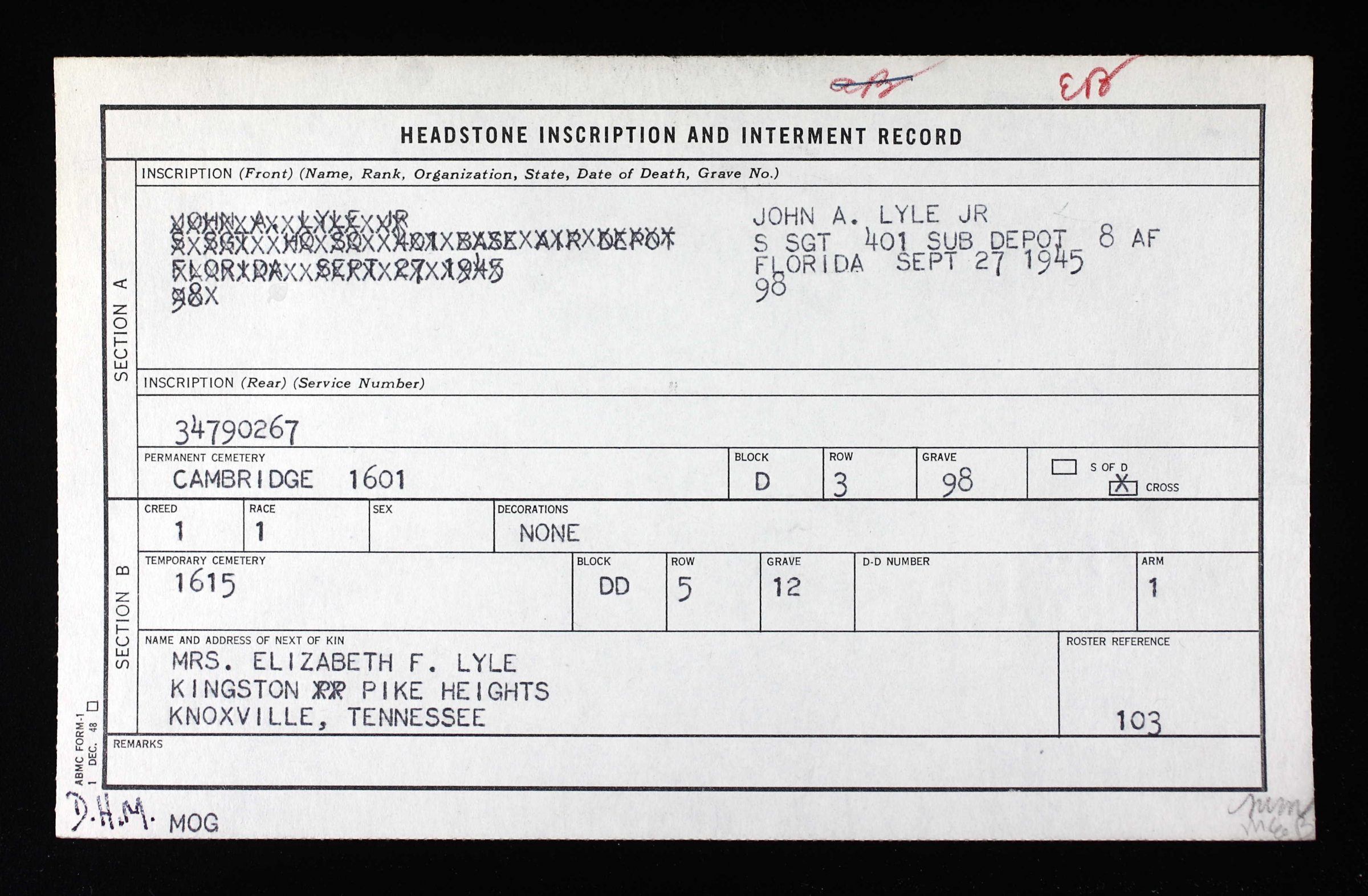 Died non Battle. Buried at the Cambridge American Cemetery, Cambridge, England, D, 3, 98