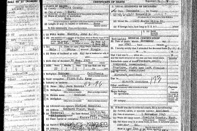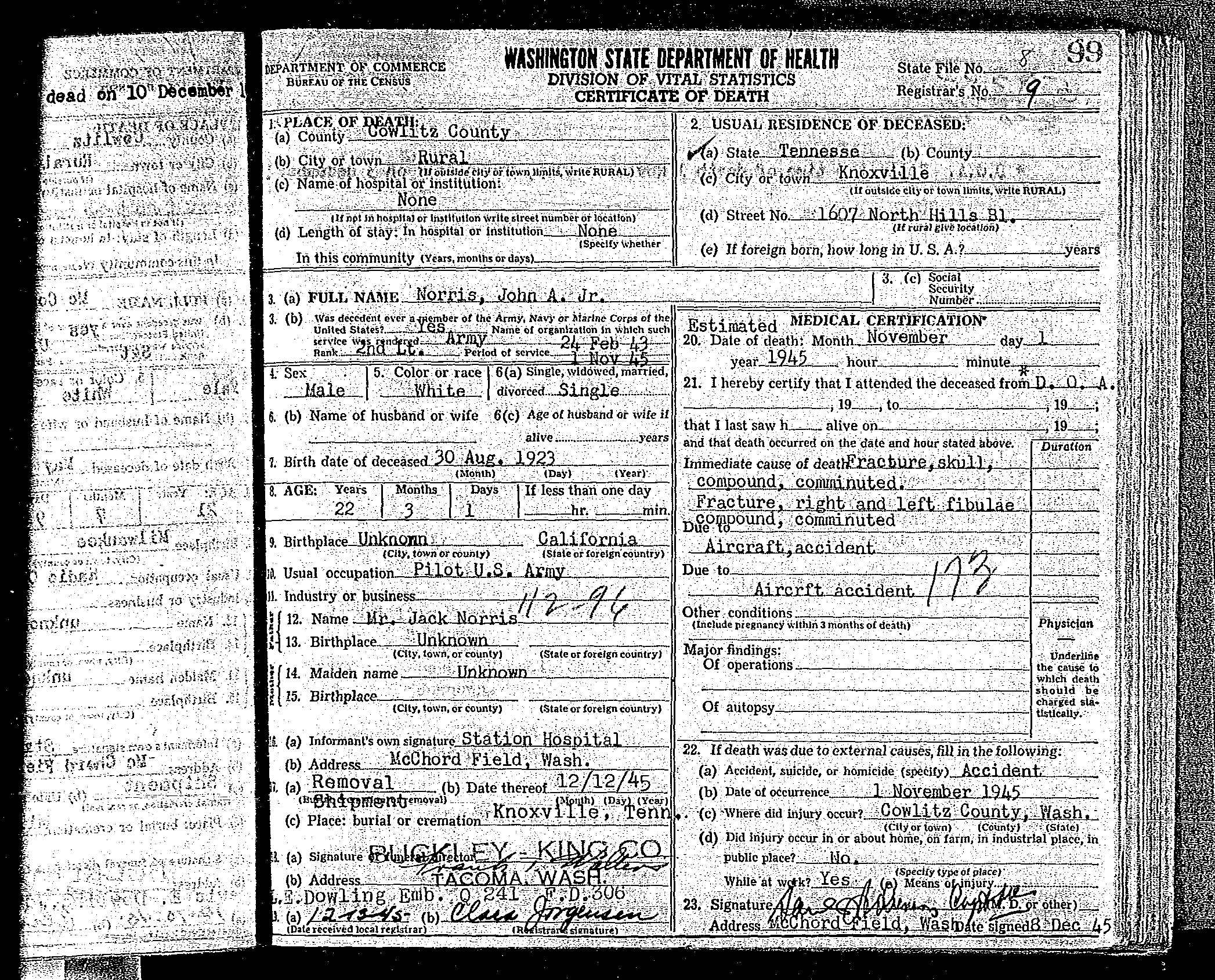 2nd Lt John A. Norris died non battle due to a airplane accident at Cowlitz County, Washington.