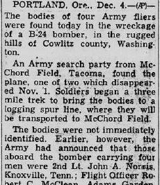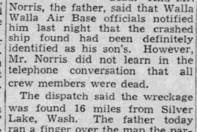 United Press announced today that wreckage of one of the two missing bombers has been found with all four crew members dead. And Mr. Norris, the father, said that Walla Walla Air Base officials notified him last night that the crashed ship found had been definitely identified as his son’s. However, Mr. Norris did not learn in the Telephone conversation that all crew members were dead.
