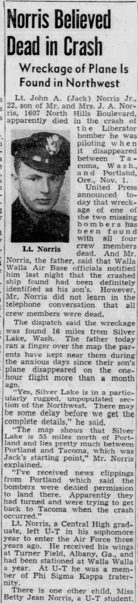 Lt. John A. (Jack) Norris Jr., 22, son of Mr. and Mrs. J.A. Norris, 1607 North Hills Boulevard, apparently died in the crash of the Liberator bobmer he was piloting when it disappeared between Tacoma, Wash., and Portland, Ore., Nov. 1.