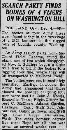 Portland, Ore., Dec. 4 – The bodies of four Army fliers were found today in the wreckage of a B-24 bomber, in the rugged hills of Cowlitz County, Washington.