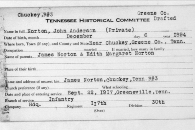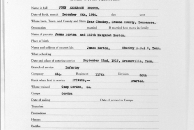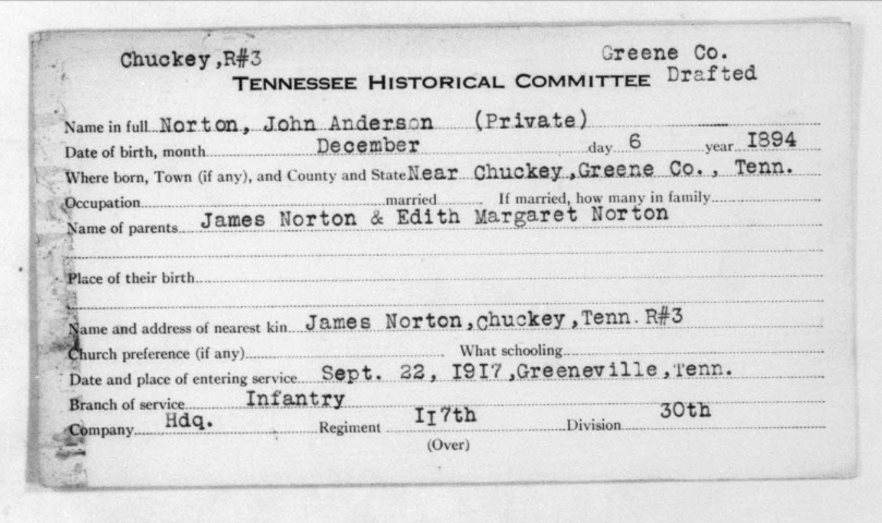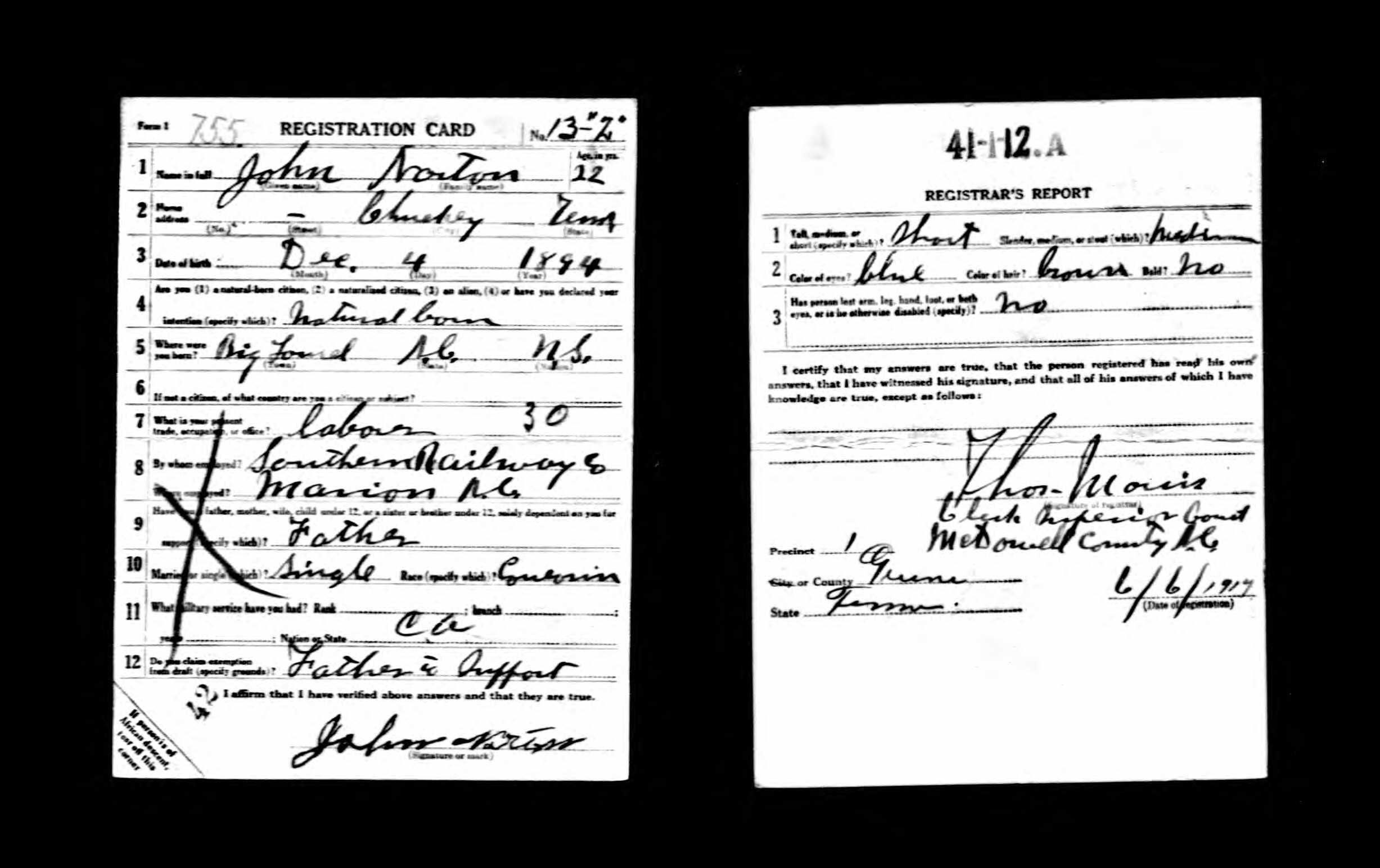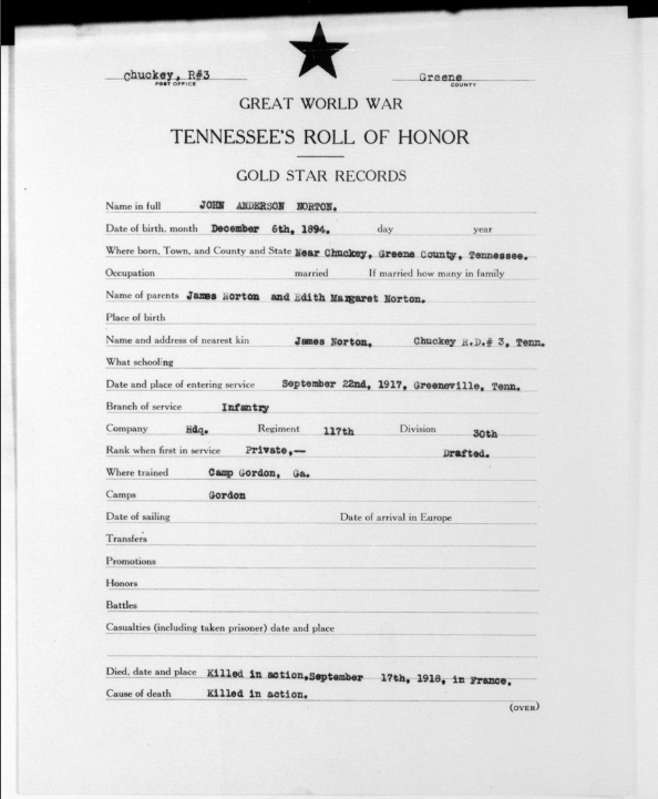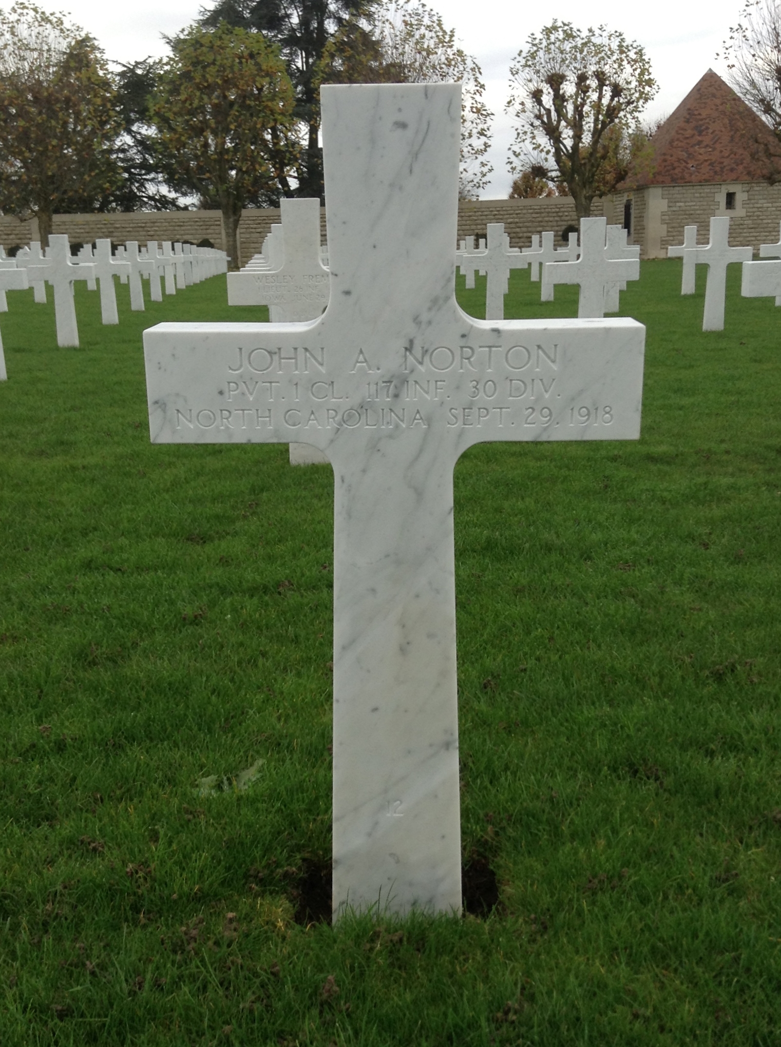 John A. Norton was born 4 December 1894, Big Laurel, Madison County, North Carolina to James Norton and Edith Margaret Shelton and cousin of Sylvester Norton. He was killed in action 29 September 1918 at Bellicourt, Departement de l’Aisne, Picardie, France and is buried at the Somme American Cemetery, Bony, France, D, 6. 12