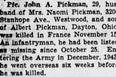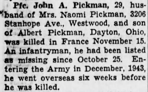 Pfc. John A. Pickman, 29, husband of Mrs. Naomi Pickman, 3206 Stanhope Ave., Westwood, and son of Albert Pickman, Dayton, Ohio, was killed in France November 15. An infantryman, he had been listed as missing since October 25. Entering the Army in December, 1943, he went overseas six weeks before he was killed.