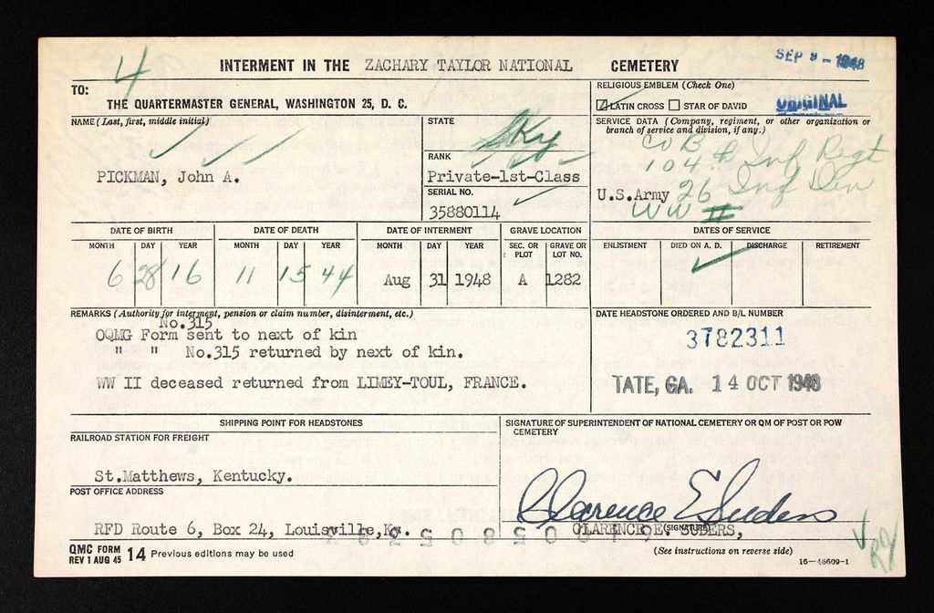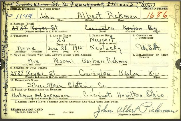 John Albert Pickman was born 28 June 1916 in Kentucky, son of Josephine Pickelman. Husband of Naomi Barbara Myers.