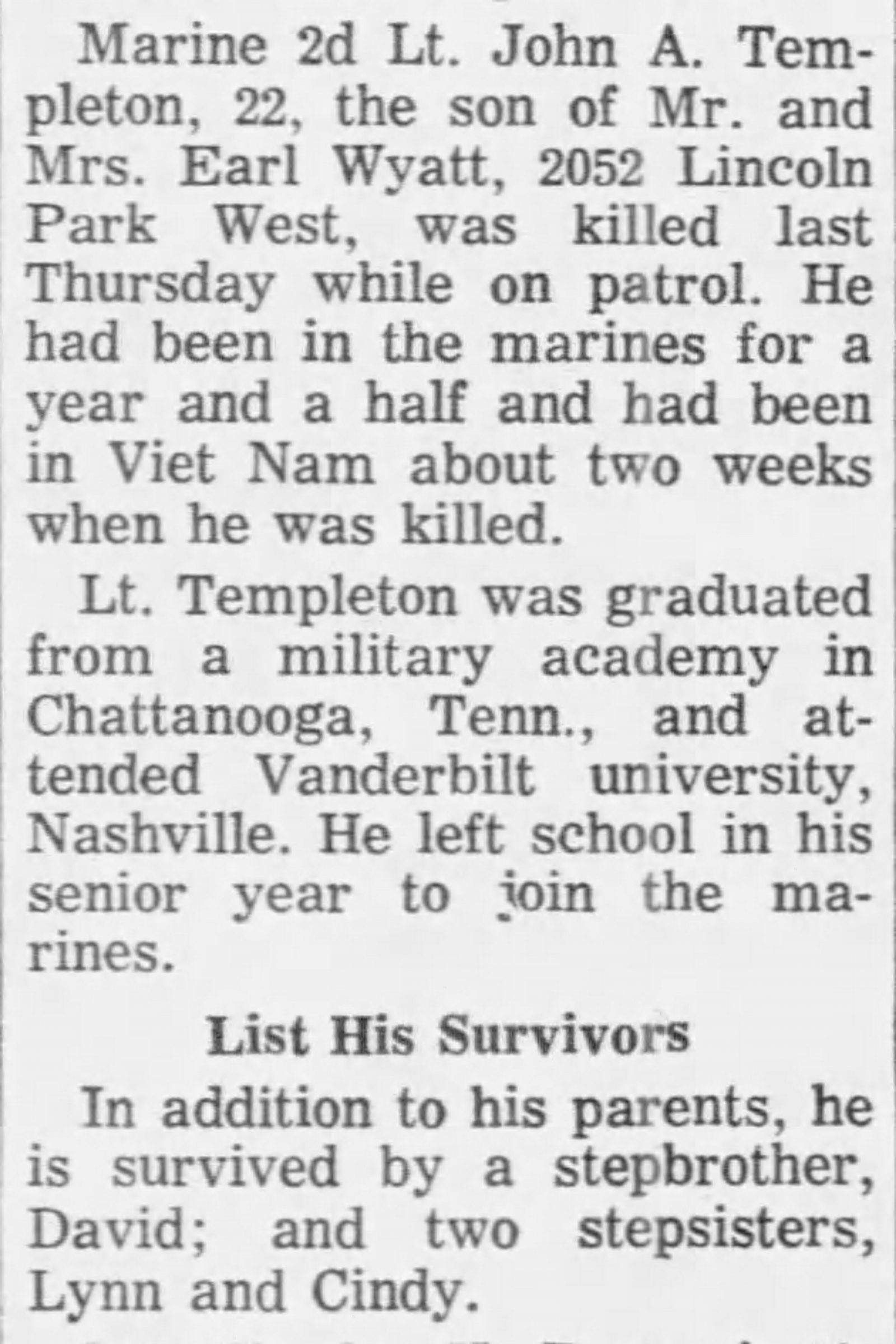 Second Lieutenant John Ashley Templeton was born on January 10, 1946, and was originally from Lake Bluff, Illinois. He graduated at McCallie High School, Chattanooga in 1960 and was graduated from a military academy in Chattanooga, TN and attended Vanderbilt university in Nashville. He left school in his senoir year to join the marines.