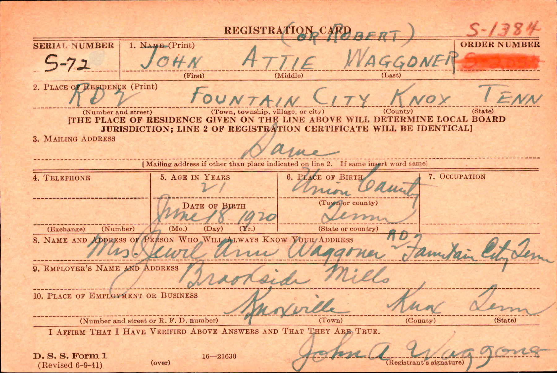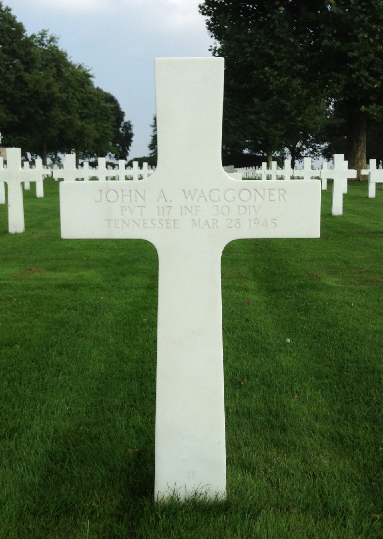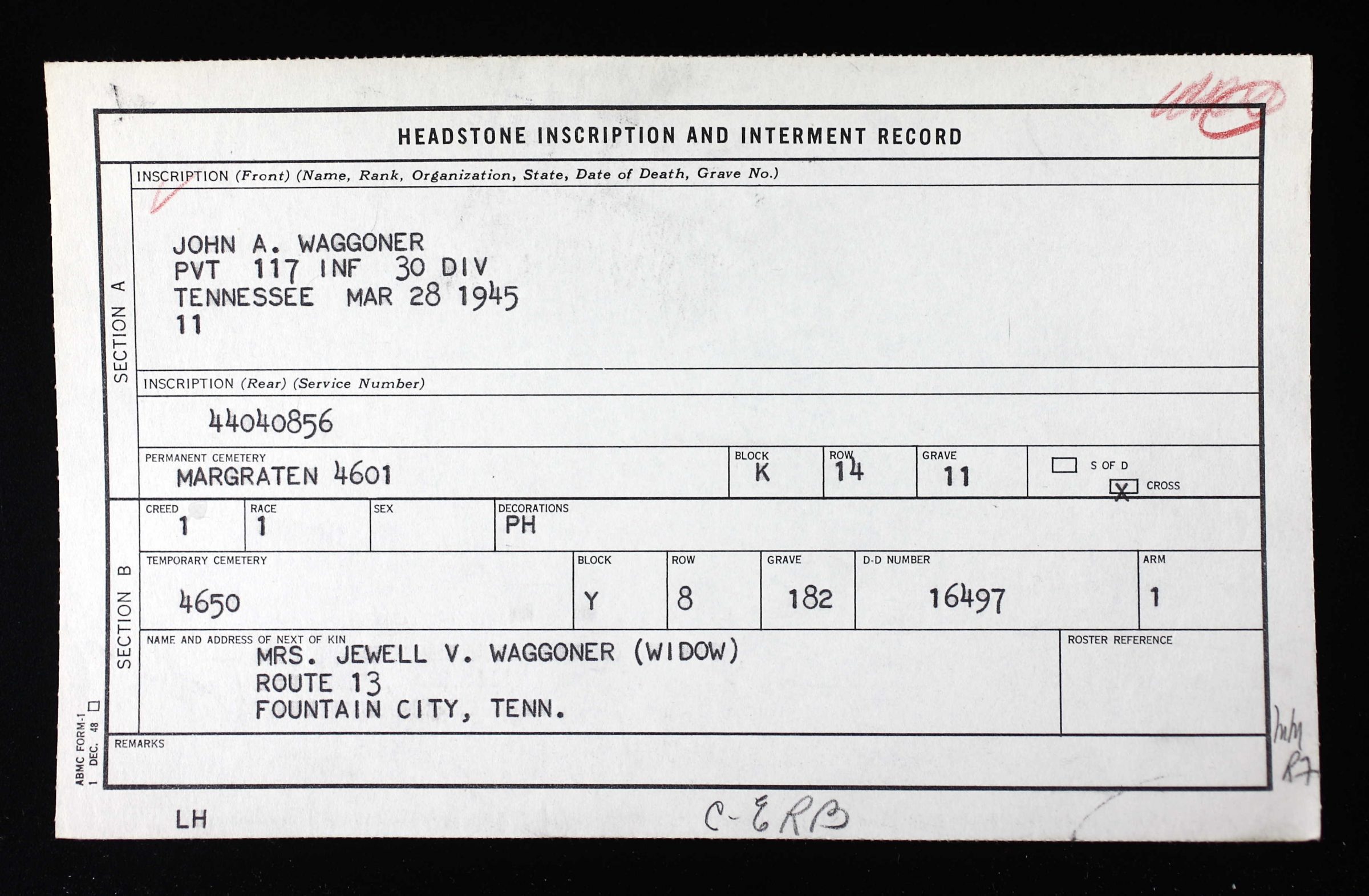 John Attie Waggoner was born in Union County, Tennessee, the son of Elder Alonzo Waggoner and Stella Hurst. He was married to Jewel Ann Varner. He enlisted on September 7, 1944 in Fort Oglethorpe, GA