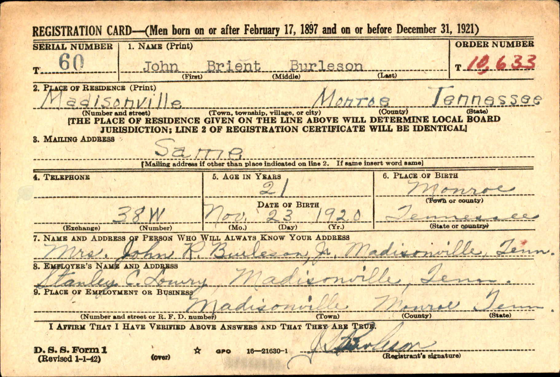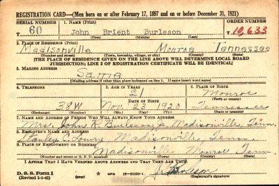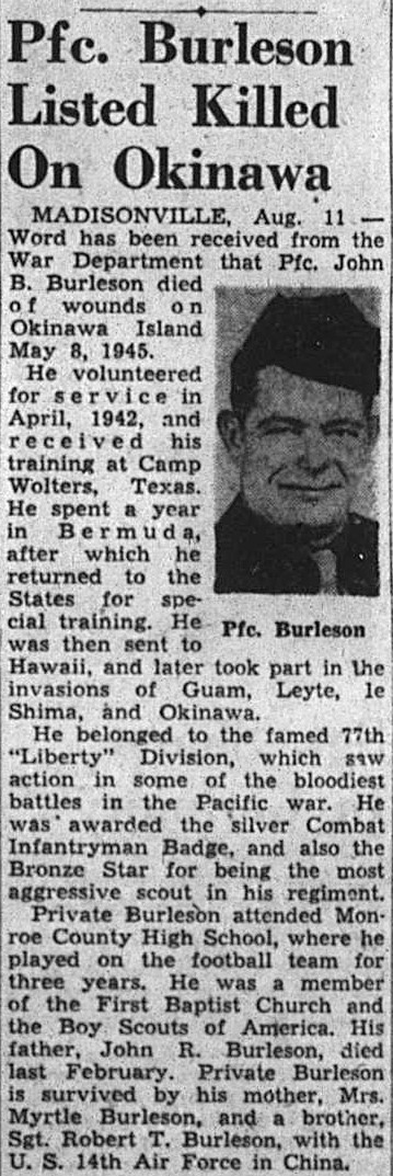 Private First Class John Brient Burleson enlisted in the US Army on April 10, 1942 at Camp Forrest, Tennessee and received his training at Camp Wolters, Texas. he spent a year in Bermuda, after which he returned to the States for special training. He was then sent to Hawaii, and later took part in the invasion of Guam, Leyte, le Shima and Okinawa. He belonged to the famed 77th “Liberty” Division, which saw action in some of the bloodiest battles in the Pacific war. He was awarded the Silver Combat Infantryman Badge, and also the Bronze Star for being the most aggressive scout in his regiment. Private Burleson attended Monroe County High School, where he played on the football team for three years. He was a member of the First Baptist Church and the Boy Scouts of America. His father, John R. Burleson, died last February. Pfc. John B. Burleson died of wounds on Okinawa Island May 8, 1945.