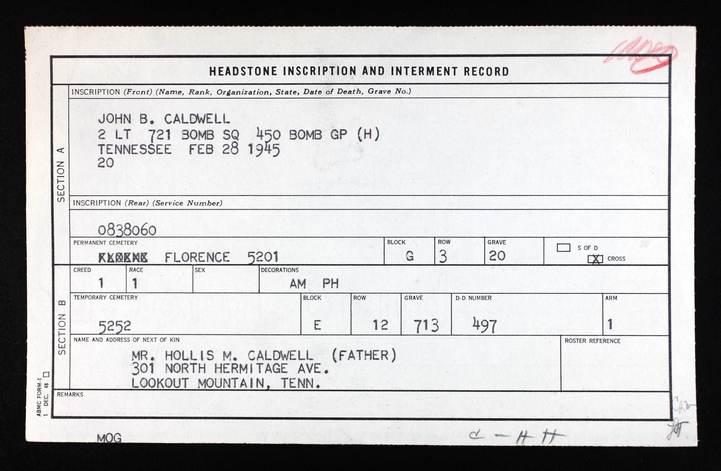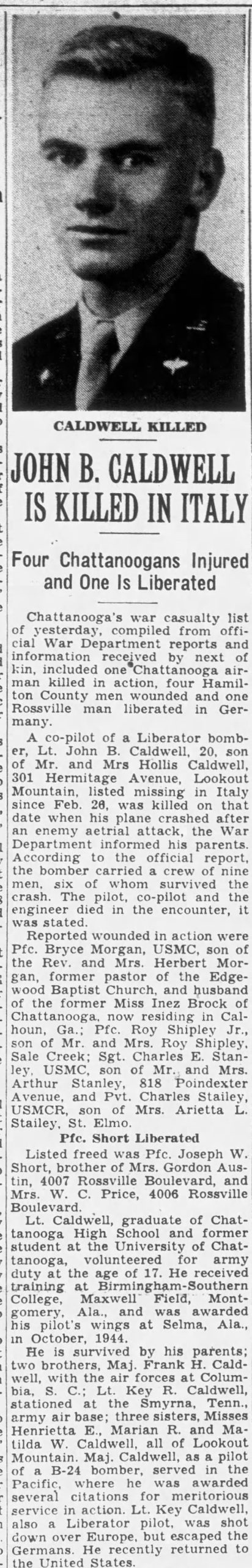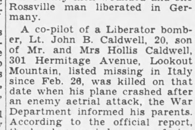 Chattanooga’s war casualty list of yesterday, compiled from official War Department reports and information received by next of kin, included one Chattanooga airman killed in action. A co-pilot of a Liberator bomber, Lt. John B. Caldwell, 20, son of Mr. and Mrs. Hollis Caldwell, 301 Hermitage Avenue, Lookout Mountain, listed missing in Italy since Feb. 26, was killed ont hat date when his plane crashed after an enemy aerial attack, the War Department informed his parents. According to the official report, the bomber carried a crew of nine men, six of whom survived the crash. The pilot, co-pilot and the engineer died in the encounter, it was stated.
