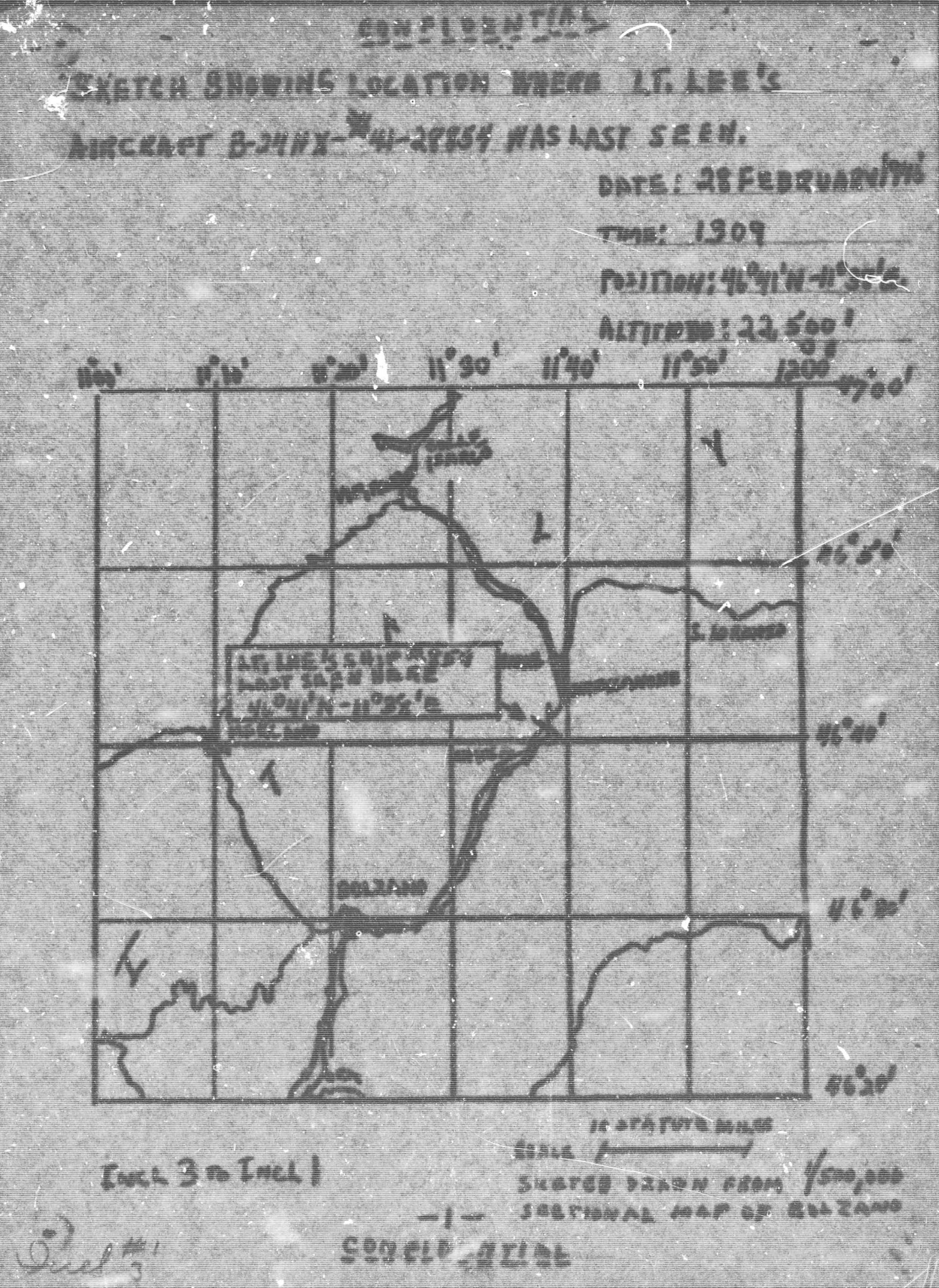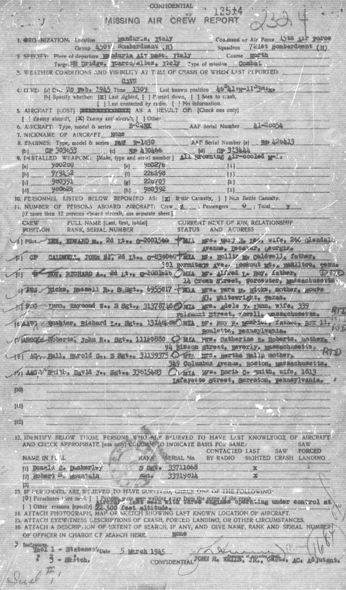 On 25 February 1945, our group was on a combat mission to bomb the railroad bridge at Isarco/Albes, Italy. I was flying as tail gunner in ship number 365 in the number two position of the first box in the first attack unit. Lieutenant Lee was pilot of a B-24HX type aircraft, serial number 41-28854 in the number three position of the same box. Approximately one minute before bombs away, Lieutenant Lee´s aircraft received a direct flak hit on the number four engine. I saw parts of the engine fly off and the engine caught on fire. The ship fell out of formation and up. Than the aircraft fell behind, dropped the right wing and lost about one thousand feet on altitude and straightened out. When I last saw this aircraft, she was under control, three engines were operating on full power, and heading due south. The fire on the number four engine was out. The altitude was approximately 22,500 feet. I saw no parachutes leave the aircraft.