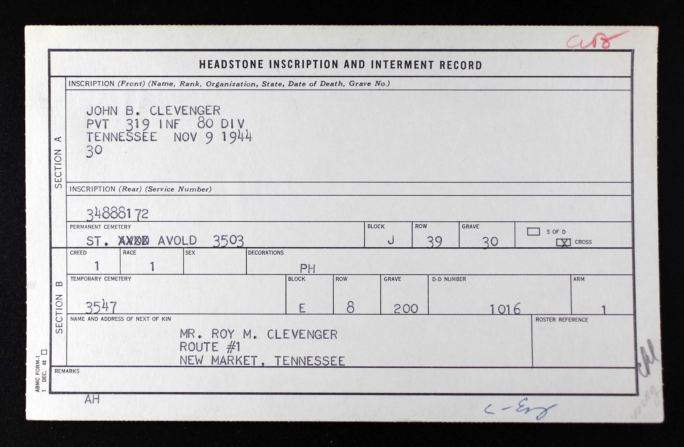 Private John B. Clevenger US Army was assigned to the 319th Infantry Regiment, 80th Infantry Division. At the time of his death, the 319th was on the assault south of the Seille River, between Abaucourt and Latricourt, France. Private Clevenger was killed in action on the 9th of November 1944. He was interred at the Lorraine American Cemetery, J,39,30, St Avold, France.