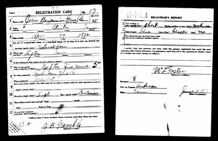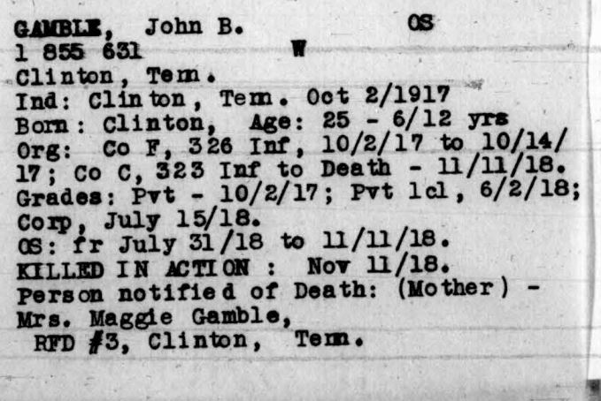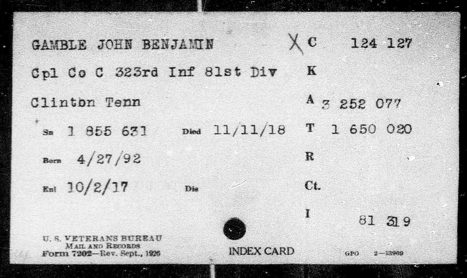Corporal John Benjamin Gamble was born 27 April 1892 and was from Clinton, TN. He was the son of Samuel H. and Maggie Gamble. He was the brother of Young Gamble, Francis T. Gamble, Oscar Gamble, Ada L. Gamble, and Eugene Gamble. He grew up living and working on the family farm in Anderson County. During his service in World War I, Corporal Gamble served in Company C, 323rd Infantry, 81st Division. He was killed in action on November 11, 1918. He is buried in Gamble Cemetery in Oak Ridge.
