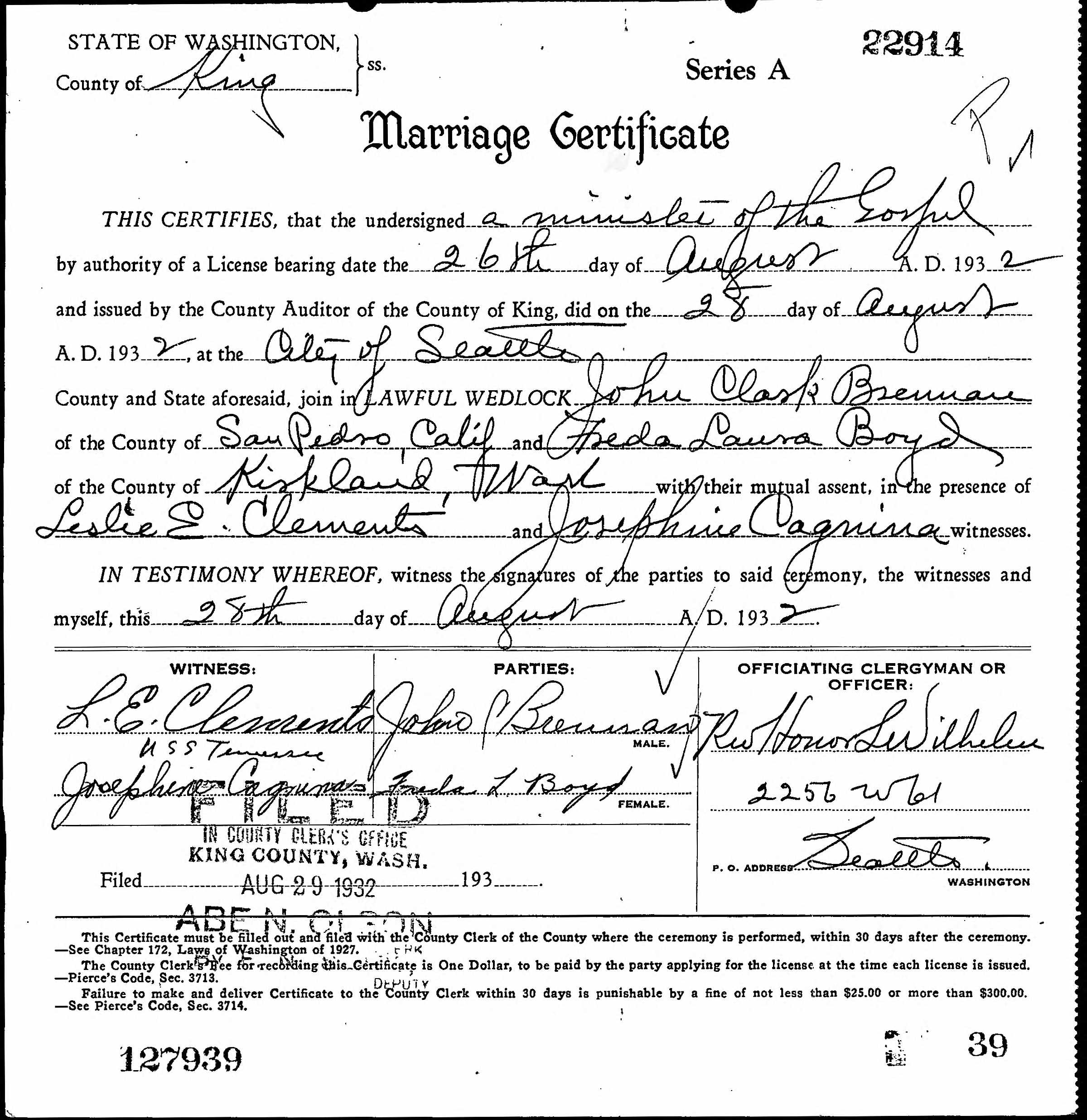 John Clark “Bill” Brennan was born in Ramsey, Minnesota, the son of Clark Augustin Brennan and Mary Etta Cruzen. He was married to Freda Laura Boyd Spidell and father of John Rex Brennan.
