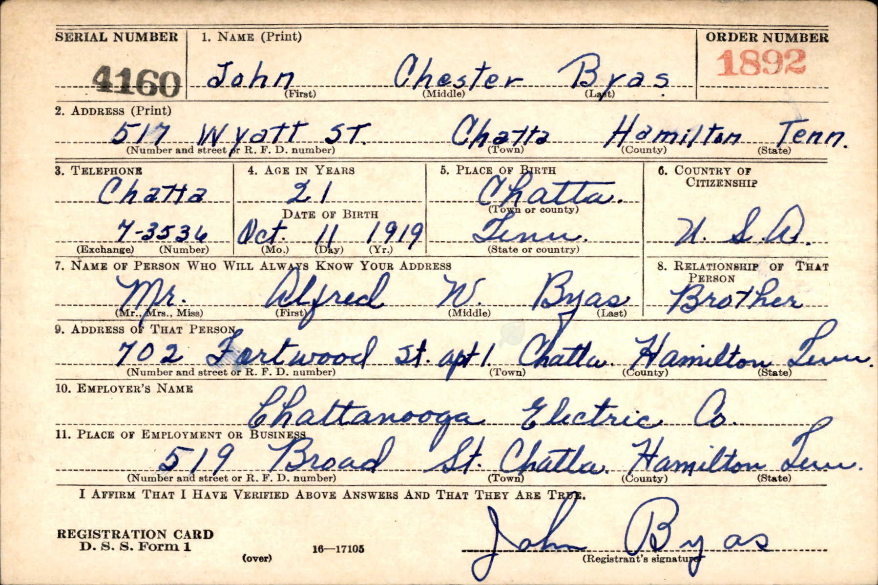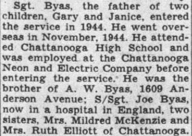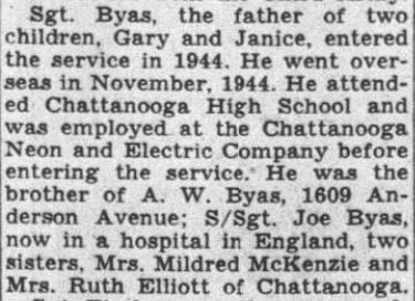 Reported killed in action was Sgt. John C. Byas, son of Mrs. J.M. Byas, 422 Walnut Street and husband of Mrs. John C. Byas, 2808 East 46th Street. Sgt. Byas, the father of two children, Gary and Janice, entered the service in 1944. He went overseas in November, 1944. He attended Chattanooga High School and was employed at the Chattanooga Neon and Electric Company before entering the service. He was the brother of A.W. Byas, 1609 Anderson Avenue; S/Sgt Joe Byas, now in a hospital in England, two sisters, Mrs. Mildred McKenzie and Mrs. Ruth Elliott of Chattanooga.