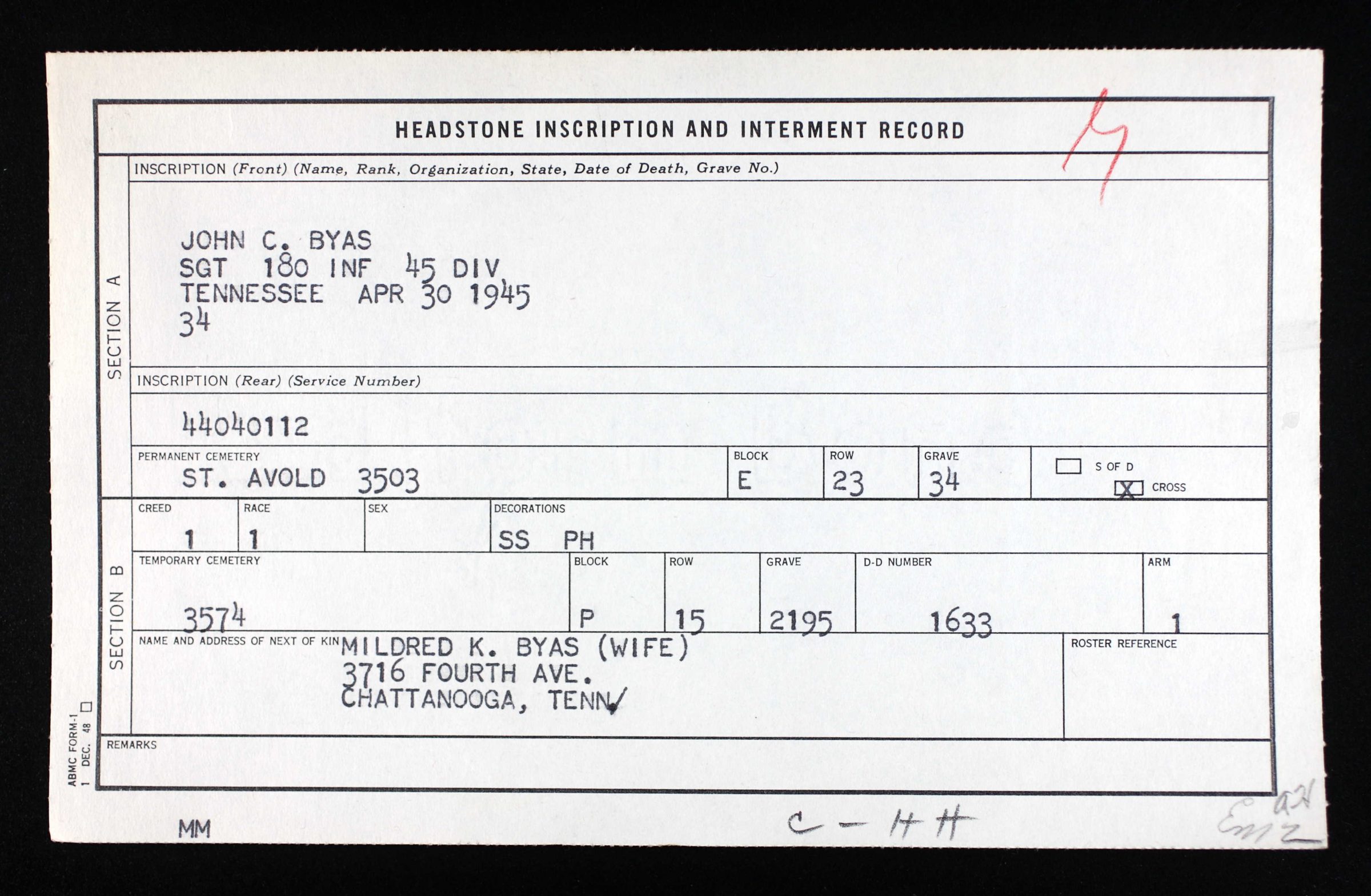 Sergeant John Chestley Byas was assigned to the 180th Infantry Regiment, 45th Infantry Division. At the time of his death the 45th had liberated Dachau Concentration Camp on the 29th of April and the next two days battled into Munich, Germany.