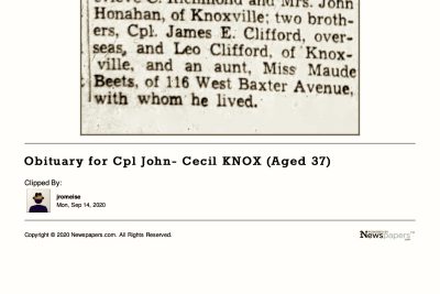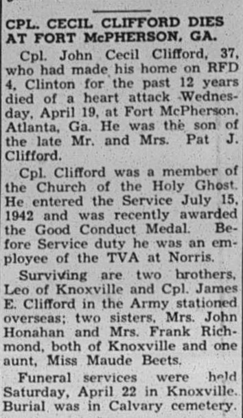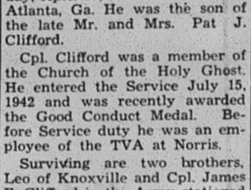Cpl. Clifford was a member of the Church of the Holy Ghost. He entered the Service July 15, 1942 and was recently awarded the Good Conduct Medal. Before Service duty he was an employee of the TVA at Norris. Surviving are two brothers, Leo of Knoxville and Cpl. James E. Clifford in the Army stationed overseas; two sisters, Mrs. John Honahan and Mrs. Frank Richmond, both of Knoxville and one aunt, Miss Maude Beets.