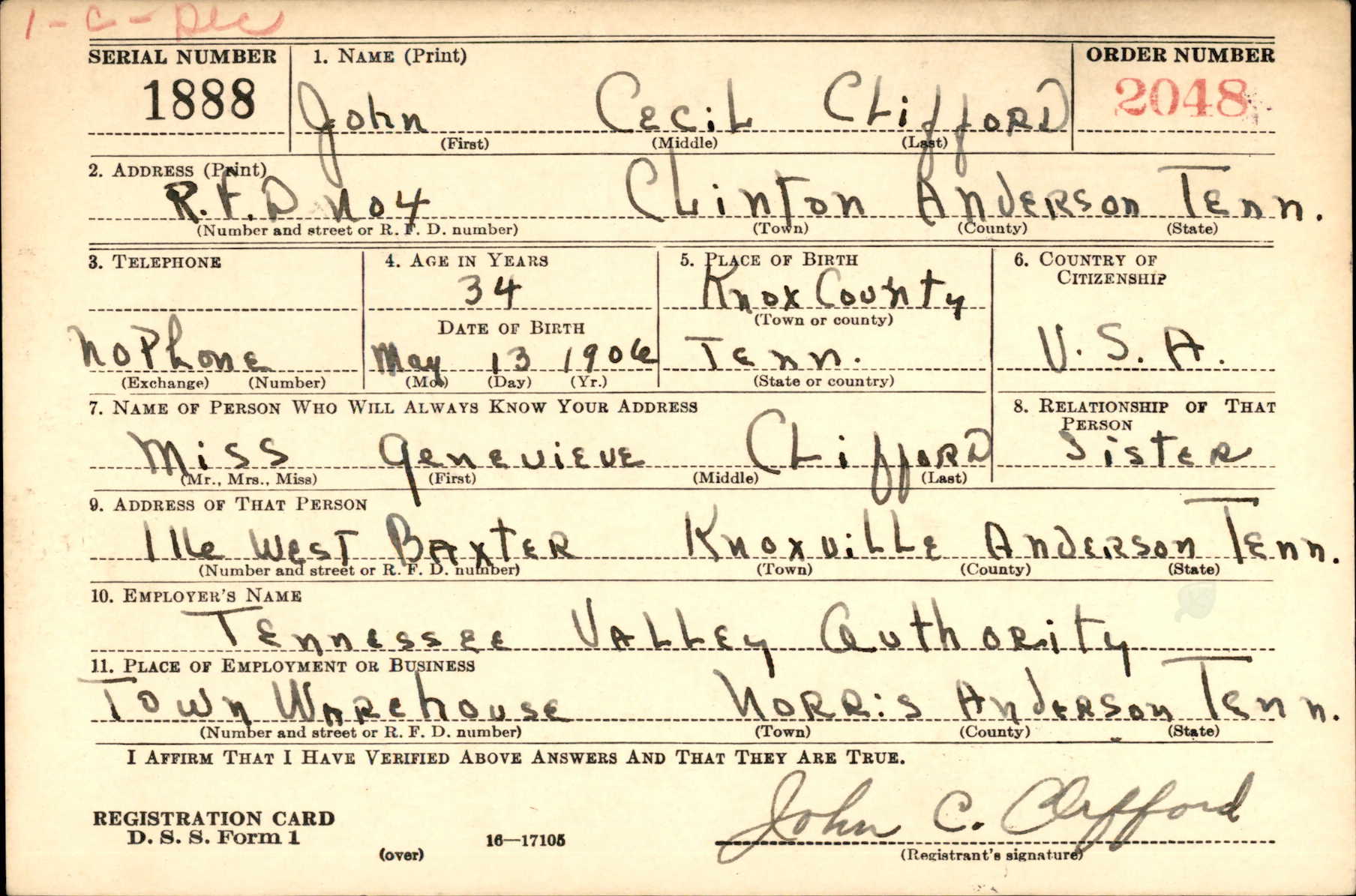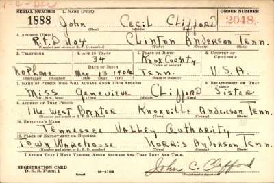 Corporal John Cecil Clifford was born in 1906 in Knoxville. He was the son of Patrick Joseph Clifford and Mary Ellen Beets Clifford. He was the brother of Leo Clifford, Anna Clifford Honohan, James E. Clifford, Genevieve Clifford, and Mary K. Clifford, who died as a child. His family had strong Irish ancestry with his grandparents being native Irish and his sister marrying a man born in Ireland. In 1920 until at least 1930, he was living in an Irish neighborhood in Knoxville with his parents; his aunt, Maud Beets; his brother, James Clifford; his sisters, Genevieve Clifford and Anna Honohan; and brother-in-law, John Honohan. As teenagers, John and James worked as hired farm hands, but by 1930, John was working as an office clerk for the railroad company, where his father and brother-in-law were also employed. Prior to joining the military, he had one year of college education.
