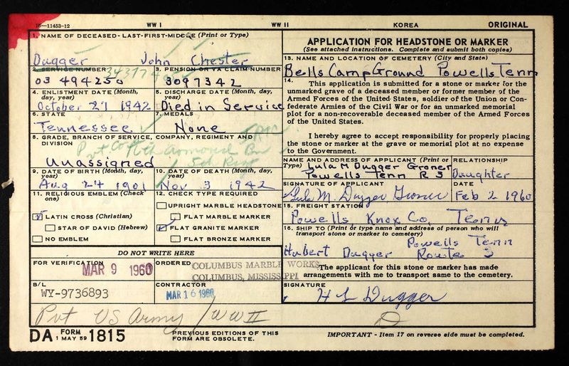 Pvt. John C. Dugger, employe of the Cotton Lunchroom, Maryville, who left last Wednesday for Fort McClellan, Ala., died there yesterday at 10 a.m., relatives here were informed. He was 41. His home was in Maryville. The body will be brought to Knoxville and taken to Weaver’s Funeral Home pending funeral announcement. His death was reported due to a heart condition. Surviving are a daughter, Miss Lula Mae Dugger; four brothers, Russell Dugger of Powell Station, Ben Harrison Dugger of the U.S. Army Medical Corps, Salt Lake City, Utah, Raymond Dugger, Military Police, New York; Hubert L. Dugger, Powell Station; three sisters, Mrs. Delsie Caldwell of Inskip, Mrs. Willa Mae Cooper and Mrs. Margaret Setters, both of Powell Station.