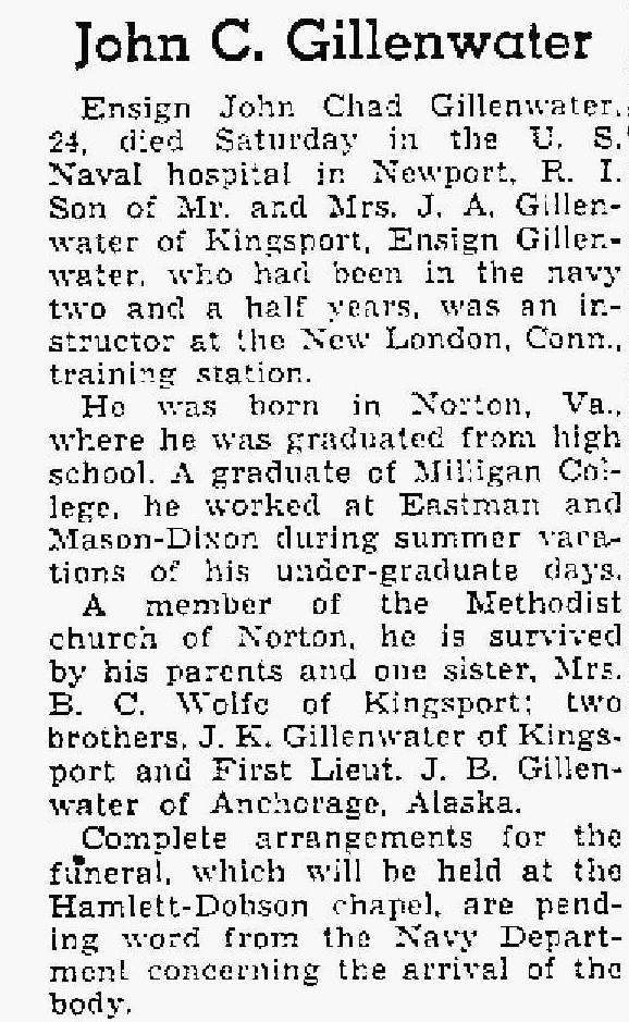 Son of Mr. and Mrs. J.A. Gillenwater of Kingsport, Ensign Gillenwater, who had been in the navy two and a half years, was an instructor at the New London, Conn., training station.