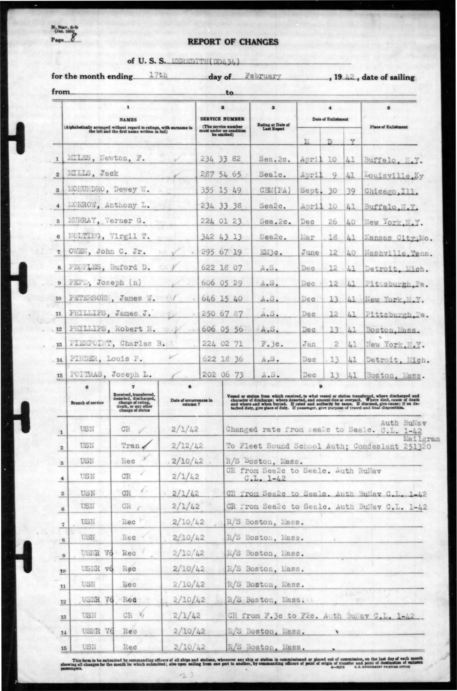 - Division/Assignment: USS Meredith (DD434)