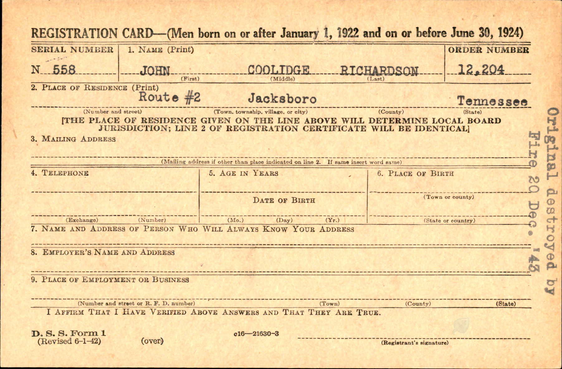 John Coolidge Richardson was born in Jacksboro, Tennessee to Lee R. Richardson and Hattie Gaylor.