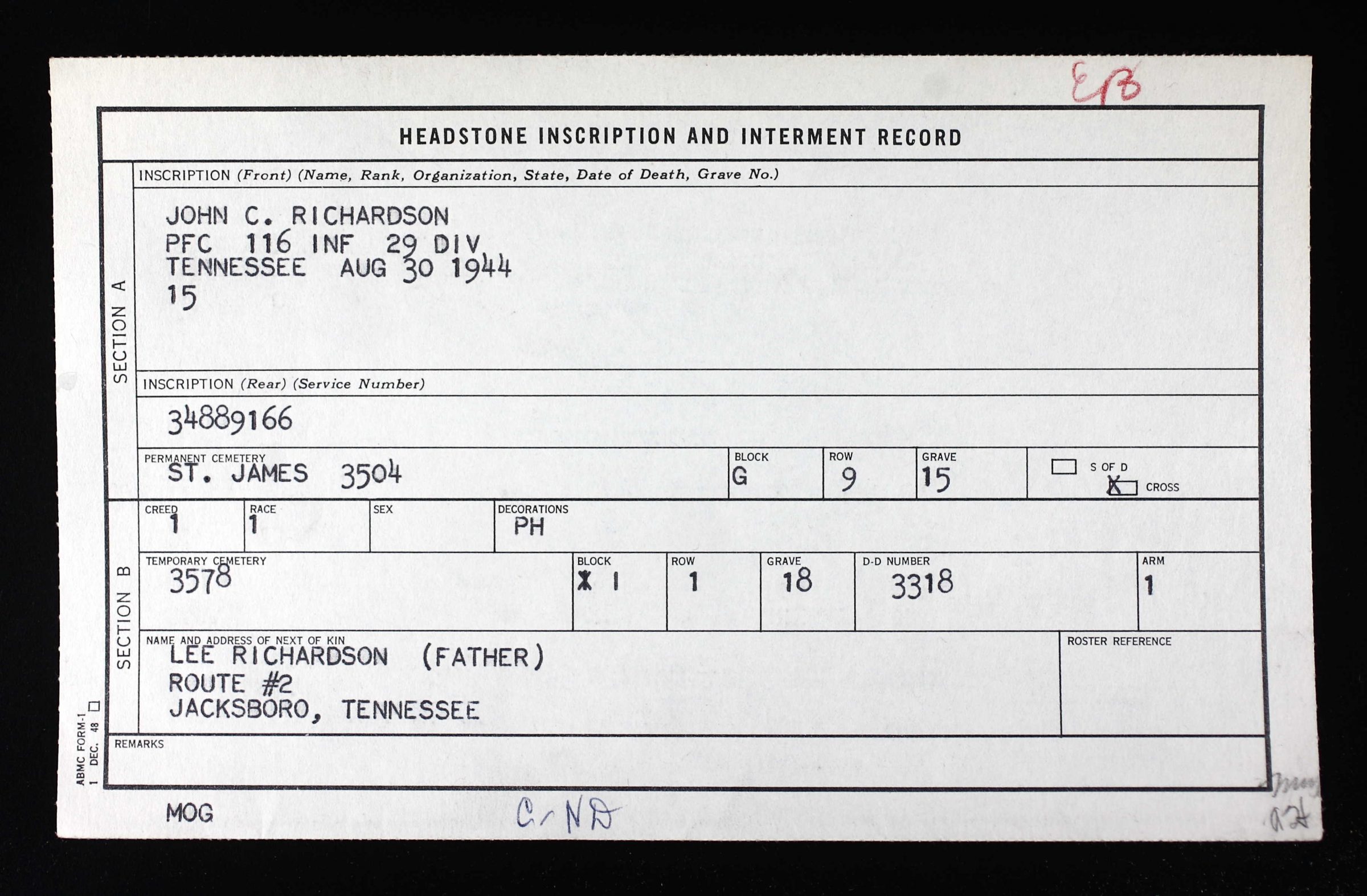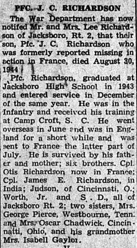 The War Department has now notified Mr. and Mrs. Lee Richardson of Jacksboro, Rt.2, that their son, Pfc J.C. Richardson, who was formerly reported missing in action in France, died August 30, 1944.