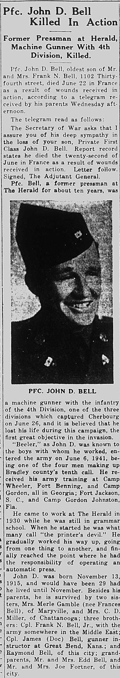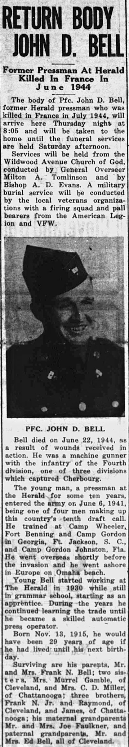 The body of Pfc. John D. Bell, former Herald pressman who as killed in France in July 1944, will arrive here Thursday night and will be taken to the home until the funeral services are held Saturday afternoon. Services will be held from the Wildwood Avenue Church of God. A military burial service will be conducted by the local veterans organization with a firing squad and pall bearers from the American Legion and VFW.