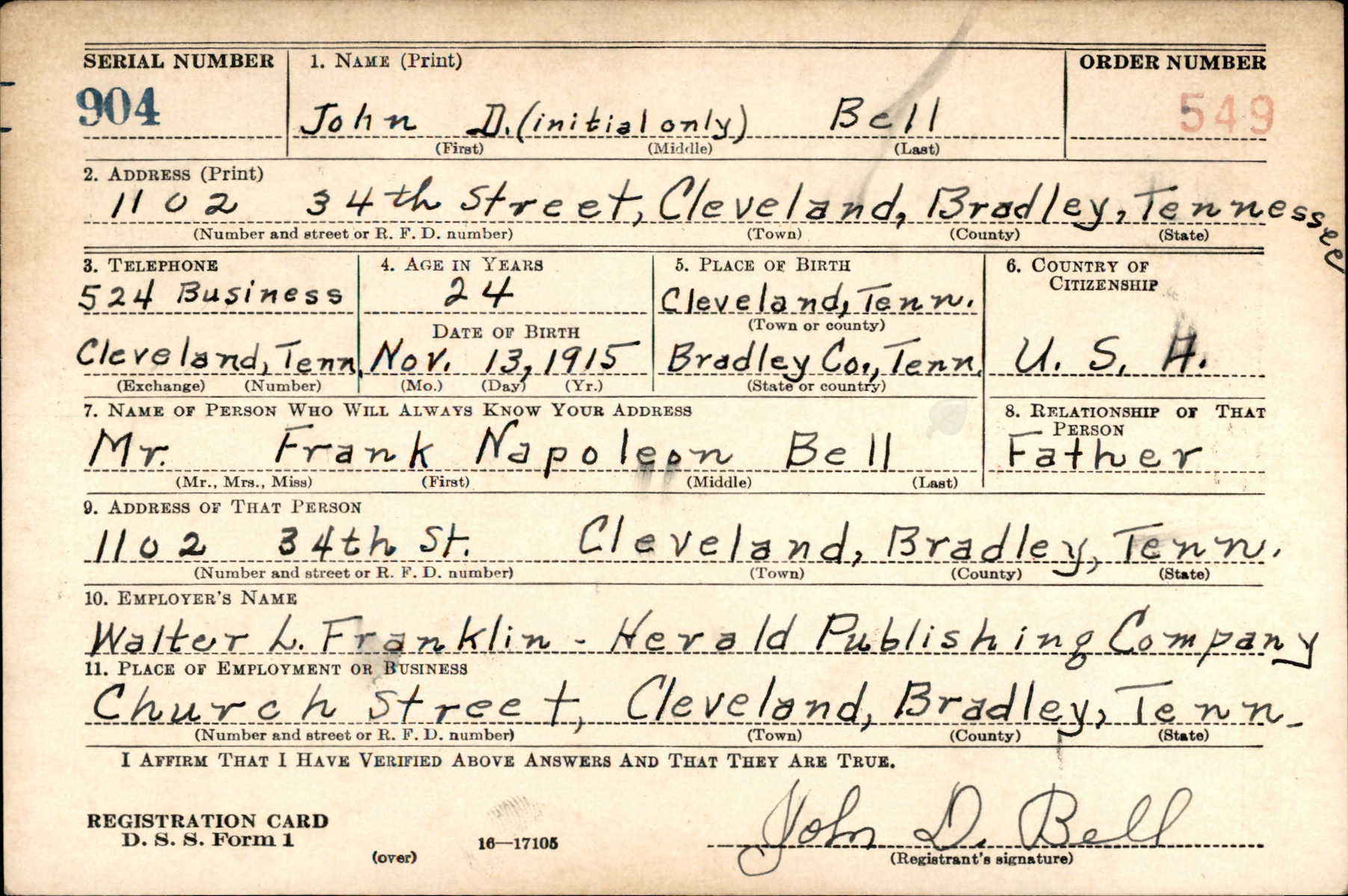 John D. Bell was born on 13 November 1915 in Cleveland, Tennessee. He was the son of Frank Napoleon Bell and Claudia Faulkner.