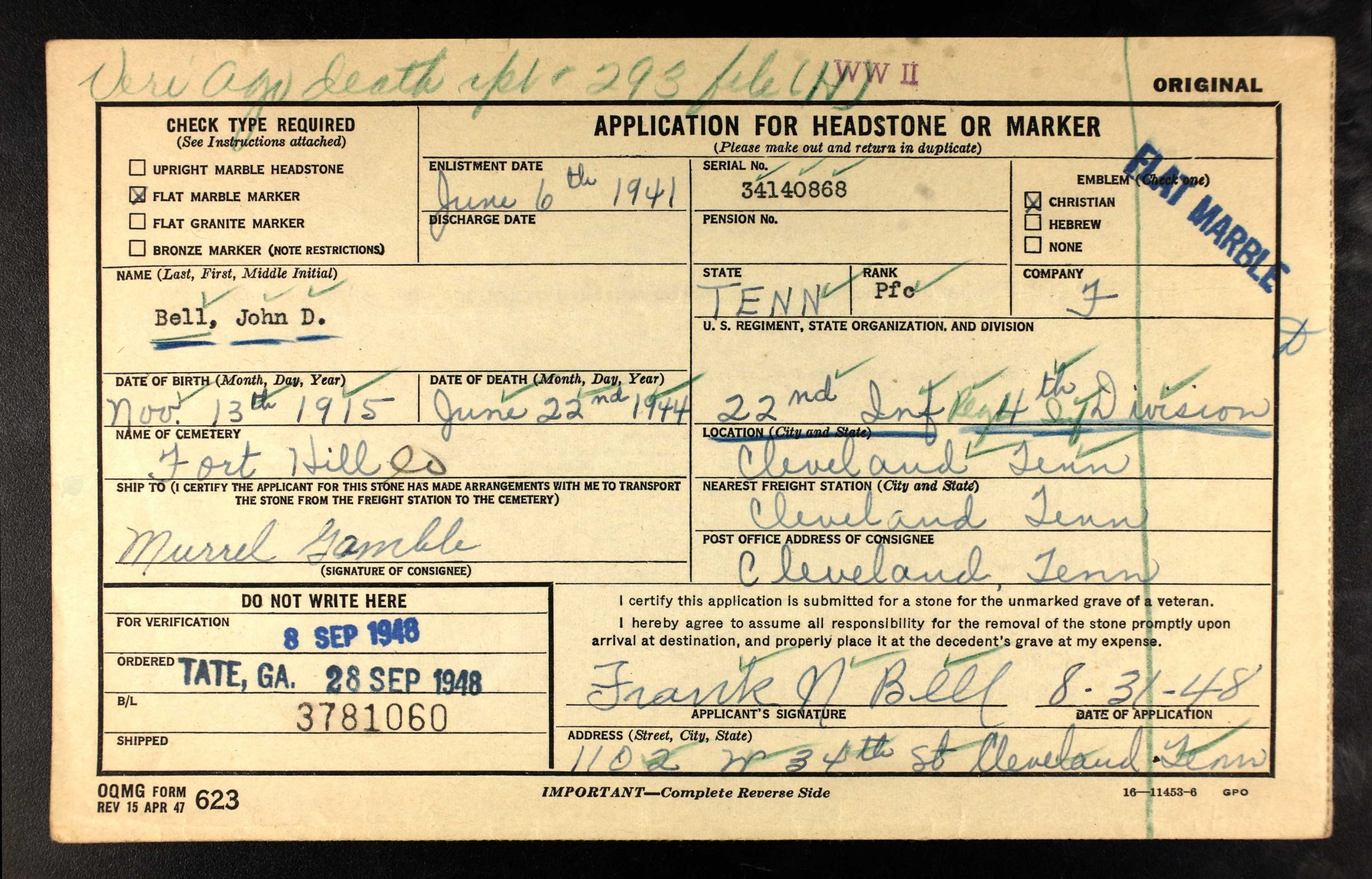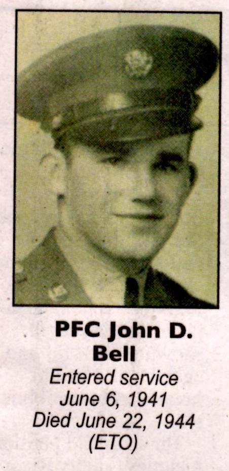 Bell died on June 22, 1944, as a result of wounds received in action. He was a machine gunner with the infantry of the Fourth division, one of three divisions which captured Cherbourg.