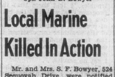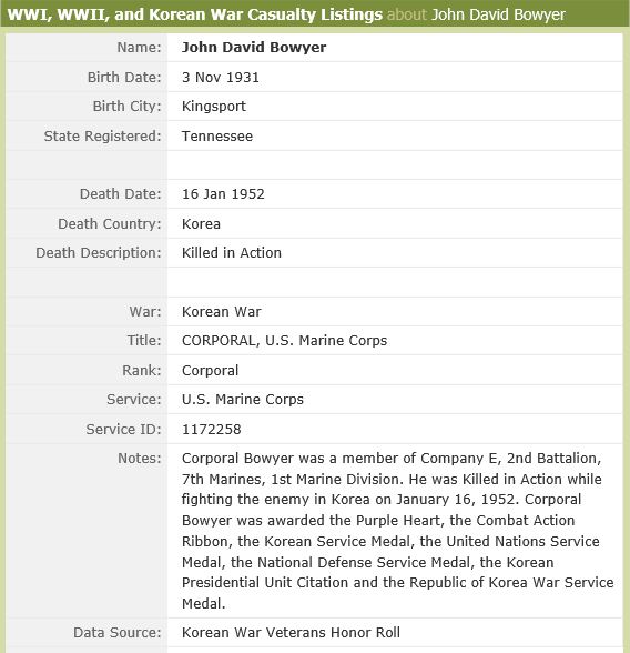 Cpl. Bowyer was with the First Marine Division, “E” Company, Second Battalion, Seventh Regiment. He enlisted in the Marines on February 6, 1951, and was made a corporal November 17. A graduate of Dobyns-Bennett High School in 1949, Bowyer worked for one year in Lubbock, Tex., and attended Texas Tech. He then returned to Kingsport and was employed for six months by Tennessee Eastman Company before entering the service. Besides his parents, he is survived, in the immediate family by two sisters, Mrs. Marjorie Cummins and Miss Sue Bowyer; and two brothers, Robert and Harry Bowyer, all of Kingsport.