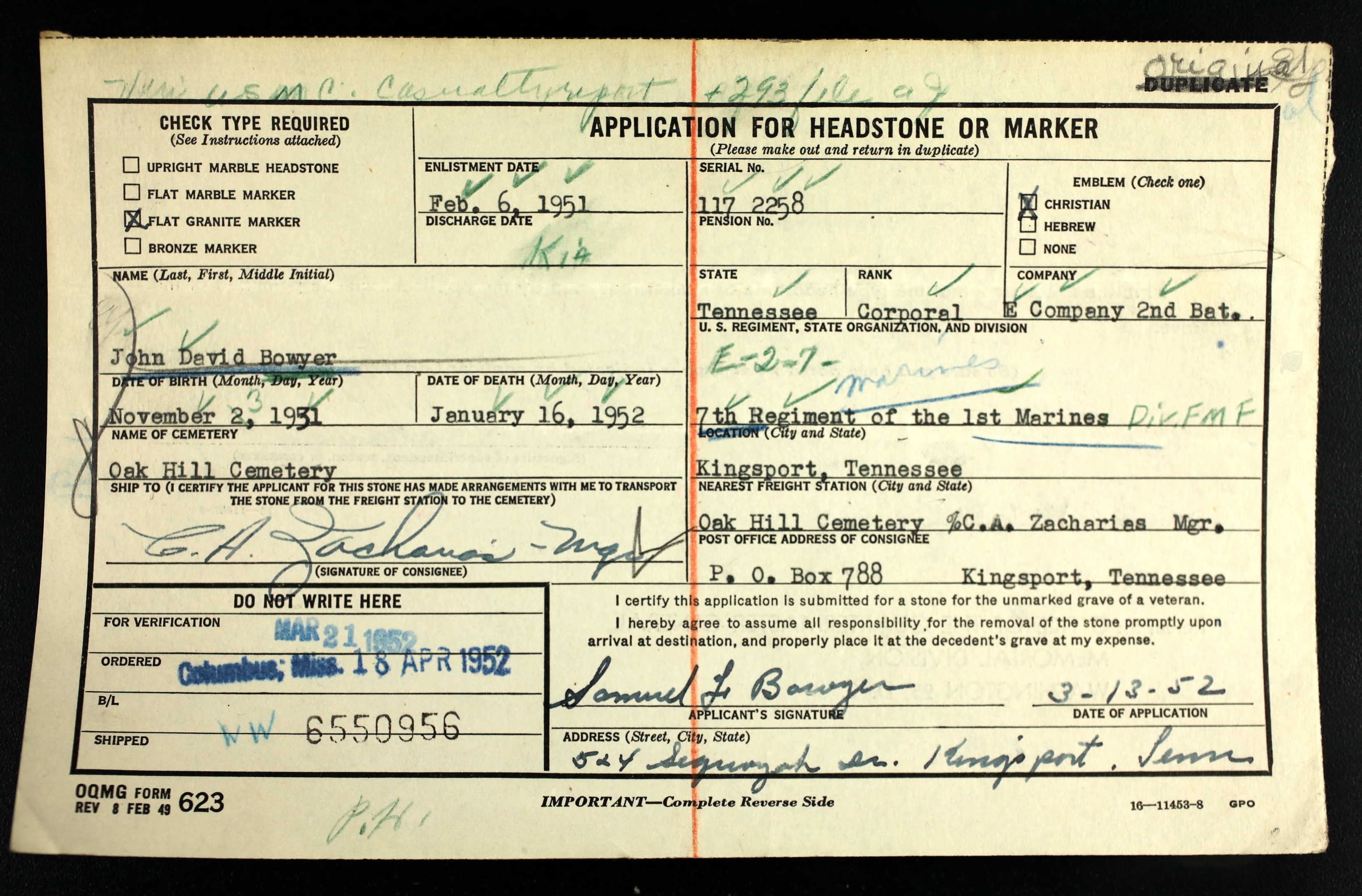 Corporal Bowyer was a member of Company E, 2nd Battalion, 7th Marines, 1st Marine Division. He was killed in action while fighting the enemy in Korea.