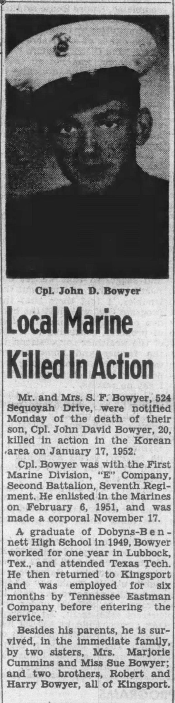 Mr. and Mrs. S.F. Bowyer, 524 Sequoyah Drive, were notified Monday of the death of their son, Cpl. John David Bowyer, 20, killed in action in the Korean area on January 17, 1952.