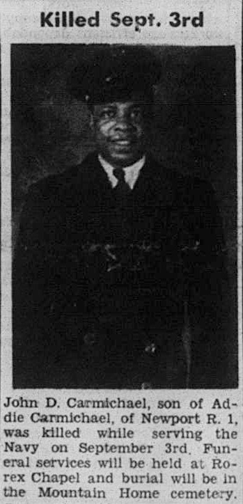 John D. Carmichael, son of Addie Carmichael of Newport, R. 1, was killed while serving the Navy on September 3rd. Funerals services will be held at Rorex Chapel and burial will be in the Mountain Home Cemetery.