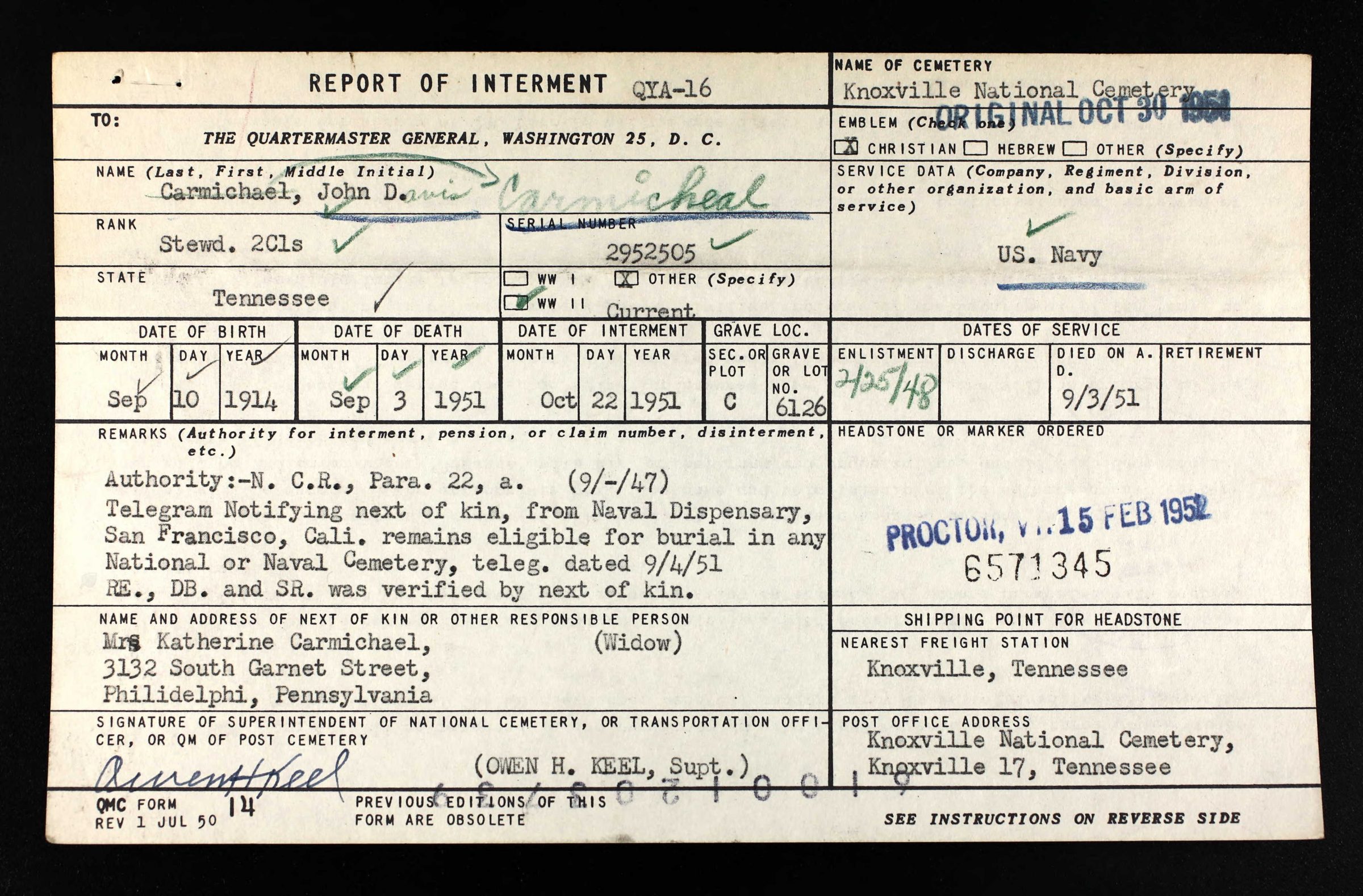 Steward Second Class Carmicheal was a member of the U.S. Navy serving in Korea. He died of other causes in Korea on September 3, 1951. Steward Second Class Carmicheal was awarded the Combat Action Ribbon, the Korean Service Medal, the United Nations Service Medal, the National Defense Service Medal, the Korean Presidential Unit Citation and the Republic of Korea War Service Medal.