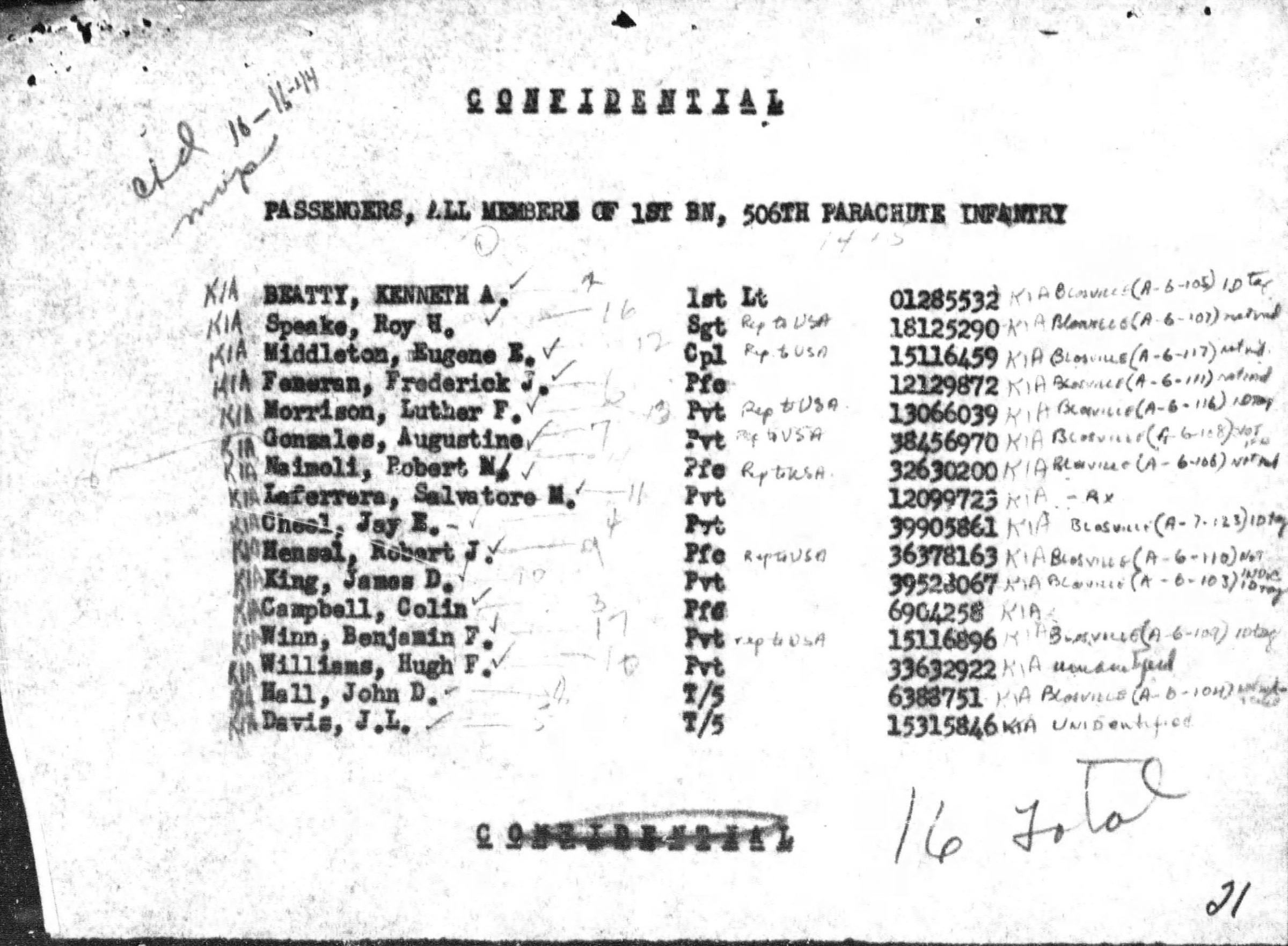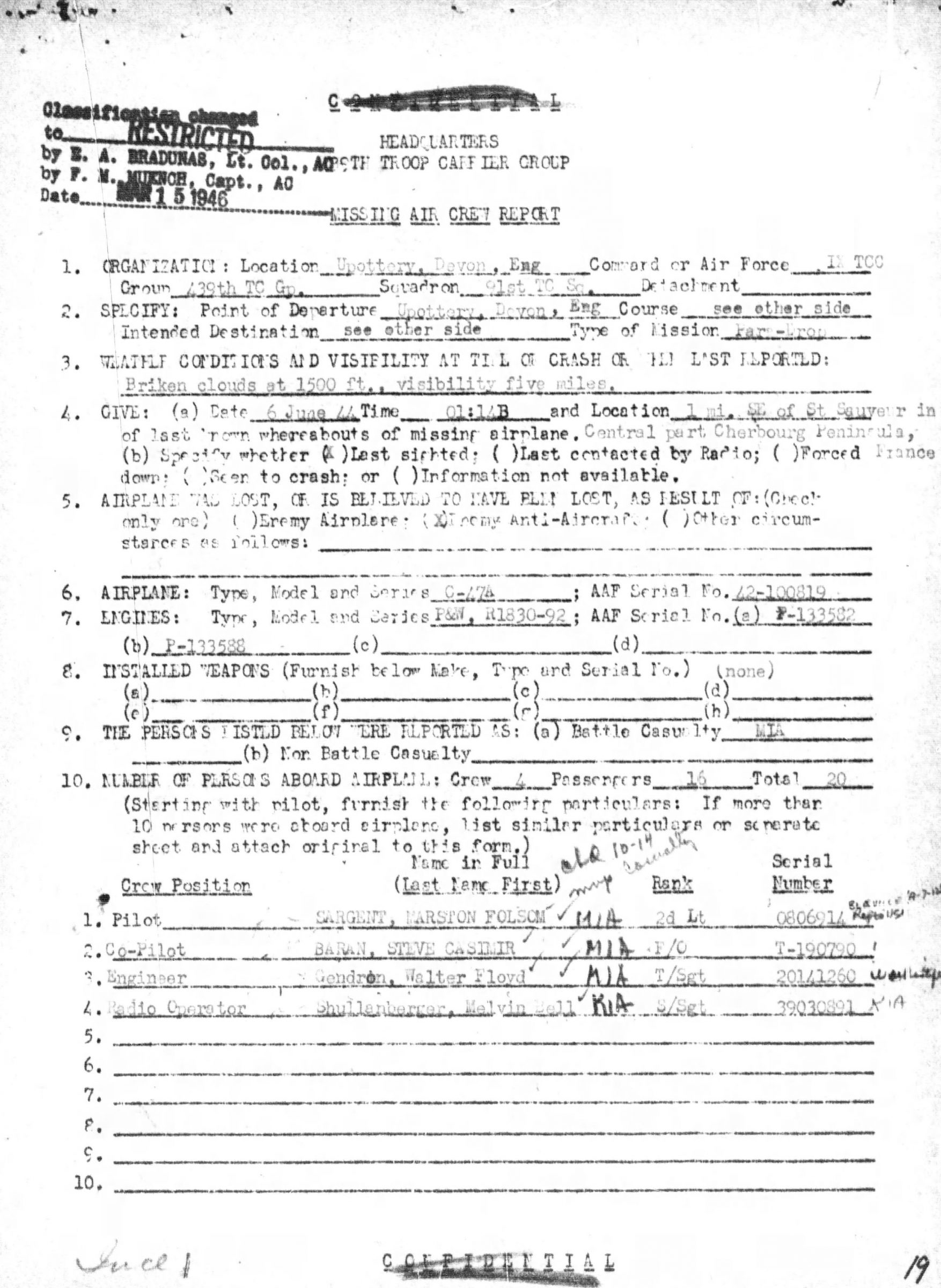 He was a passenger on aircraft C-47A with serial number 42-100819. They departed from Upottery, Devon, England on a Para-drop to France.