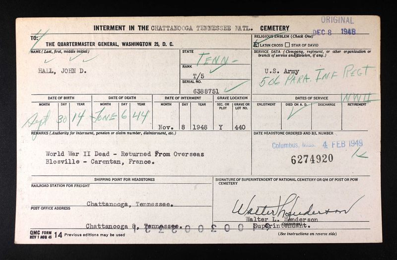 Technical Sergeant John D. Hall was assigned to the 506th Parachute infantry Regiment, 101st Airborne Division. He died on 6 June 1944 during the D-Day invasion of Normandy, France.