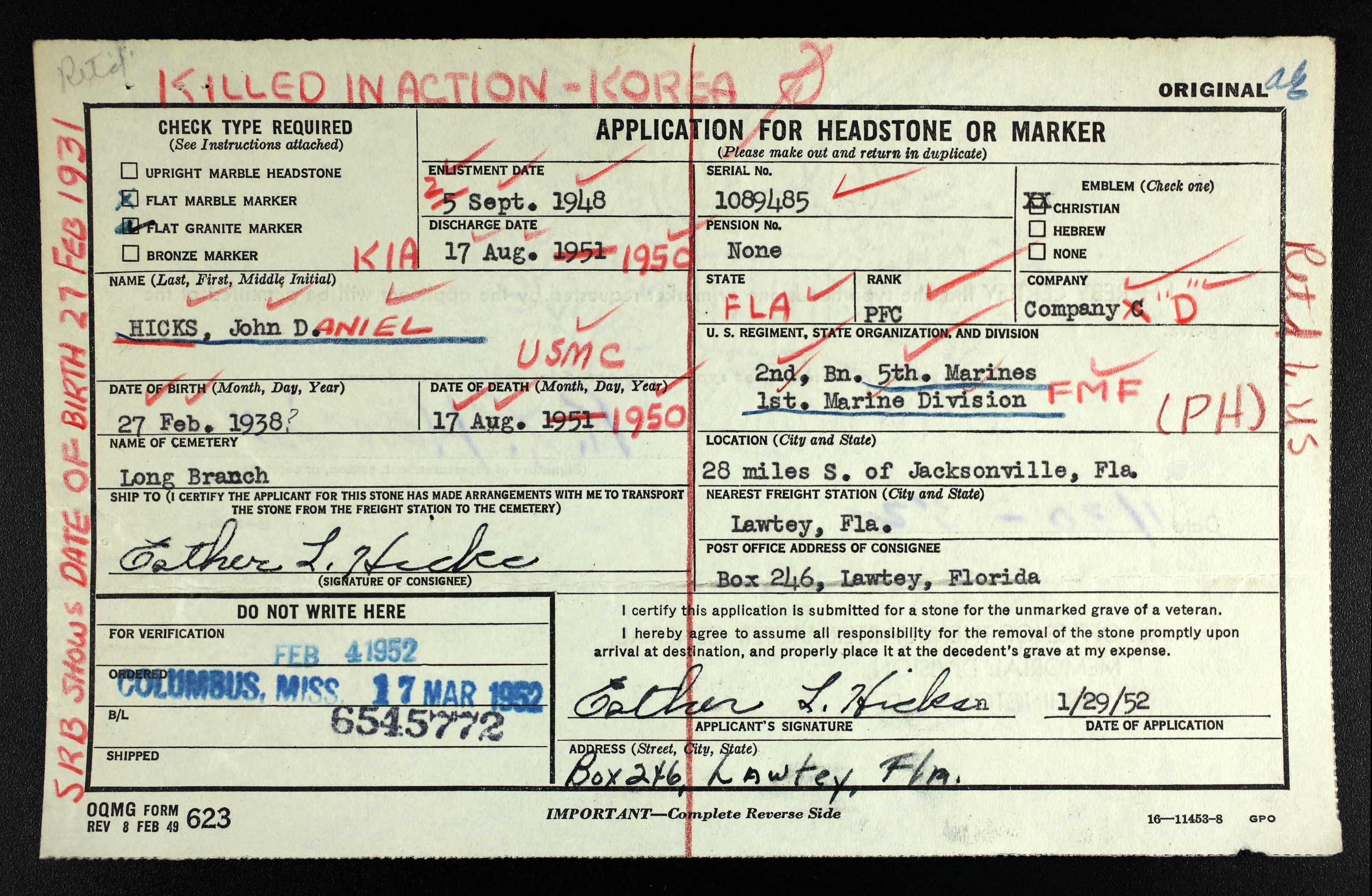 Private First Class Hicks was a member of the Support Company, 1st Service Battalion, 1st Provisional Marine Brigade. On August 17, 1950, along the Natkong River, South Korea, he sacrificed his life for others by falling on an enemy grenade.