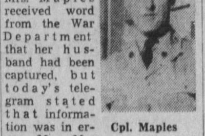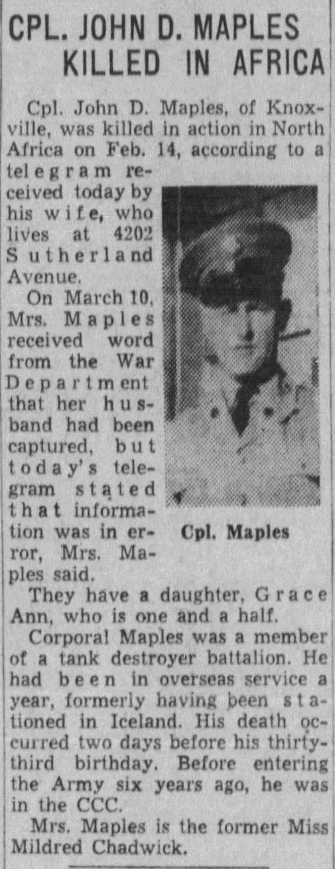 Cpl. John D. Maples, of Knoxville, was killed in action in North Africa on Feb. 14, according to a telegram received by his wife, who lives at 4202 Sutherland Avenue. On March 10, Mrs. Maples receied word from the War Department that her husband had been captured, but today’s telegram stated that information was an error, Mrs. Maples said. They have a daughter, Grace Ann, who is one and a half. Corpora Maples was a member of a tank destroyer battalion. He had been in overseas service a year, formerly having been stationed in Iceland. His death ocurred two days before his 33rd birthday. Before entering the Army six years ago, he was int he CCC. Mrs. Maples, is the former Miss Mildred Chadwick.