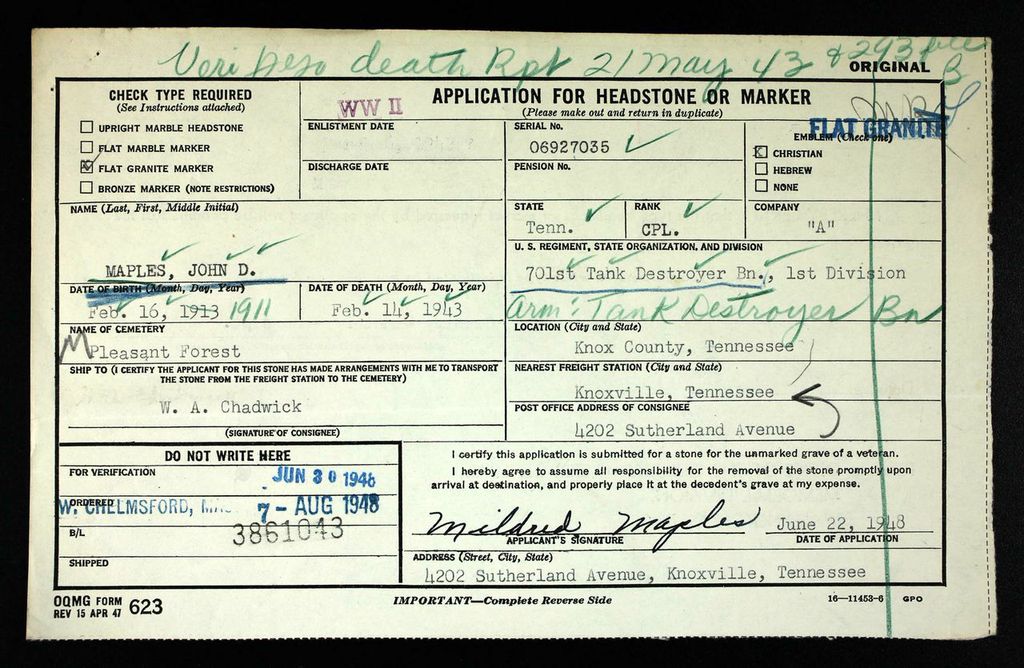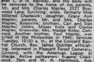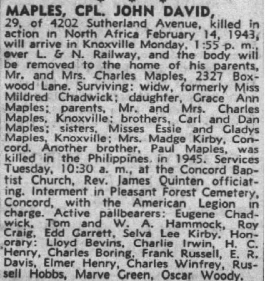 Cpl. John David Maples, 29, of 4202 Sutherland Avenue, killed in action in North Africa February 14, 1943, will arrive in Knoxville over L&N Railway, and the body will be removed to the home of his parents, Mr. and Mrs. Charles Maples, 2327 Boxwood Lane. Surviving: widow, formerly Miss Mildred Chadwick; daughter, Grace Ann Maples; parents, Mr. and Mrs. Charles Maples, Knoxville; brothers, Carl and Dan Maples, Knoxville; sisters, Misses Essie and Gladys Maples, Knoxville; Mrs. Madge Korby, Concord. Another brother, Paul Maples, was killed in the Philippines in 1945.