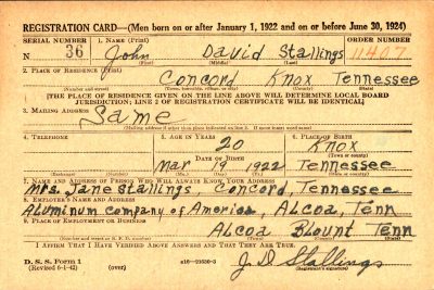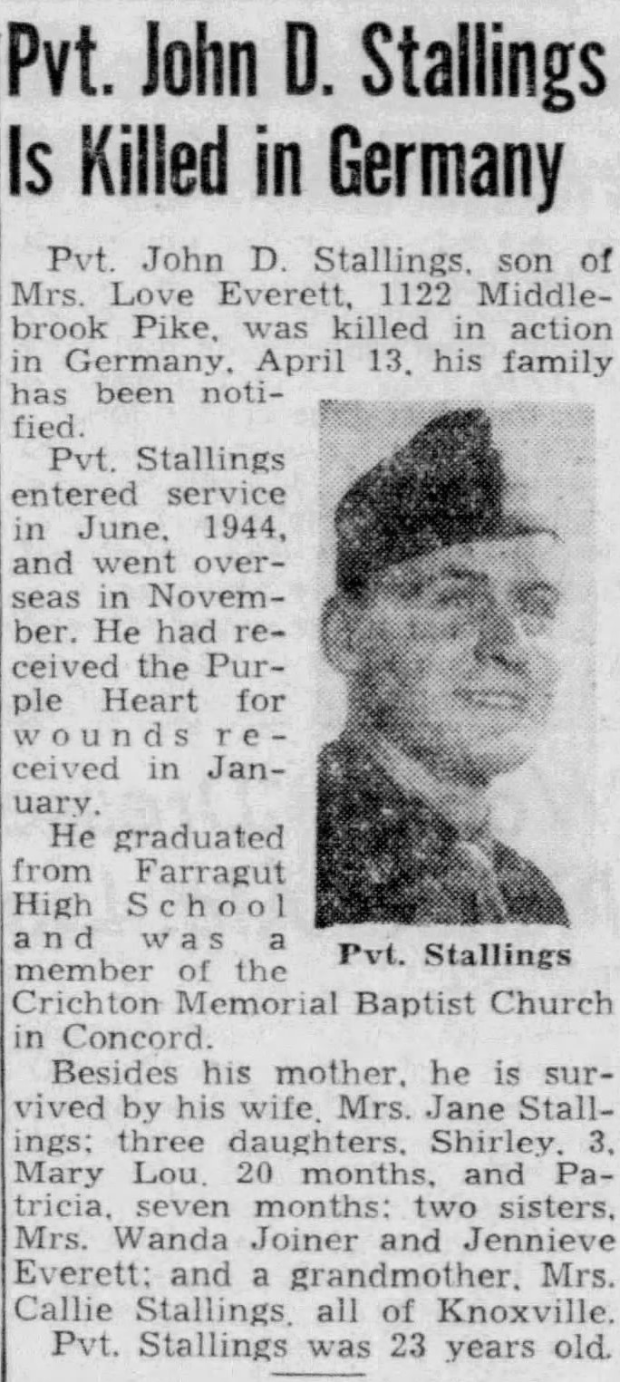 Pvt. John D. Stallings, son of Mrs. Love Everett, 1122 Middlebrook Pike, was killed in action in germany, April 13, his family has been notified. Pvt Stallings entered service in June, 1944, and went overseas in November. He had received the Purple Heart for wounds received in January. He graduated from Farragut High School and was a member of the Crichton Memorial Baptist Church in Concord. Besides his mother, he is survived by his wife, Mrs. Jane Stallings; three daughters, Shirley, 3, Mary Lou, 20 months, and Patricia, seven months; two sisters, Mrs. Wanda Joiner and Jennieve Everett; and a grandmother, Mrs. Callie Stallings, all of Knoxville. Pvt. Stallings was 23 years old.